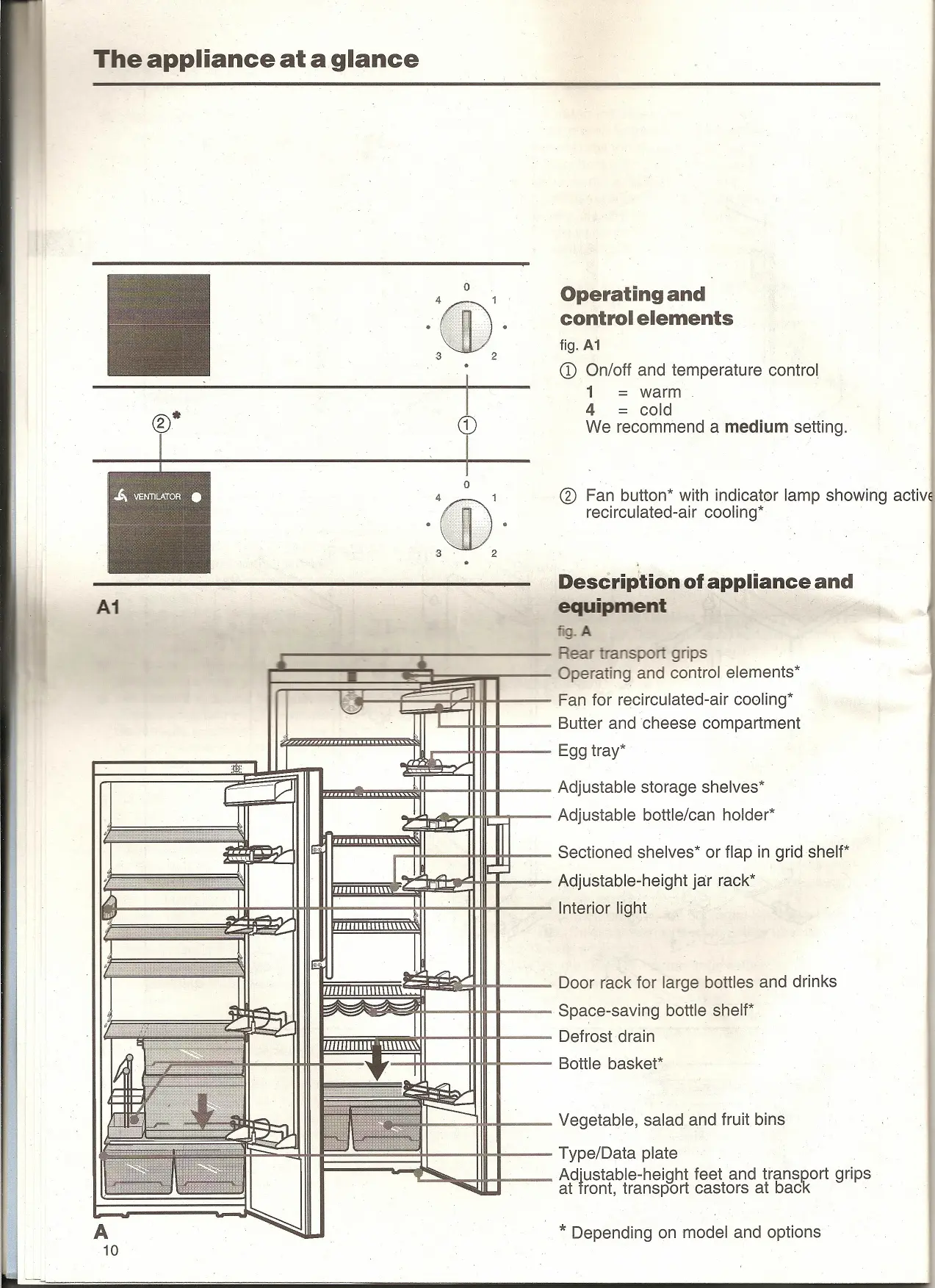 res, e.g. 2 bins for storing fruit and vegetables separately ~ Sectioned glass shelf* or flap in grid shelf* for tall containers ~ Practical door arrangement and space for tall bottles ~ Door handle with integrated opening mechanism* ~ Integrated transport grips ~ Transport castors at back ~ Adjustable-height feet at front Page Operating instructions The appliance at a glance Additional benefits, contents Safety instructions and warnings Disposai notes Se . 9 up 2 0 era 'on and control elements Sa ety regulations Co ecting to the mains Switching the appliance on and off Setting the temperature Fan switch Energy savings 3 Storage, shelf arrangement, interior light Arranging food in the refrigerator Changing shelf arrangement Interior light 4 Defrosting, cleaning 5 Troubleshooting Customer service and type plate