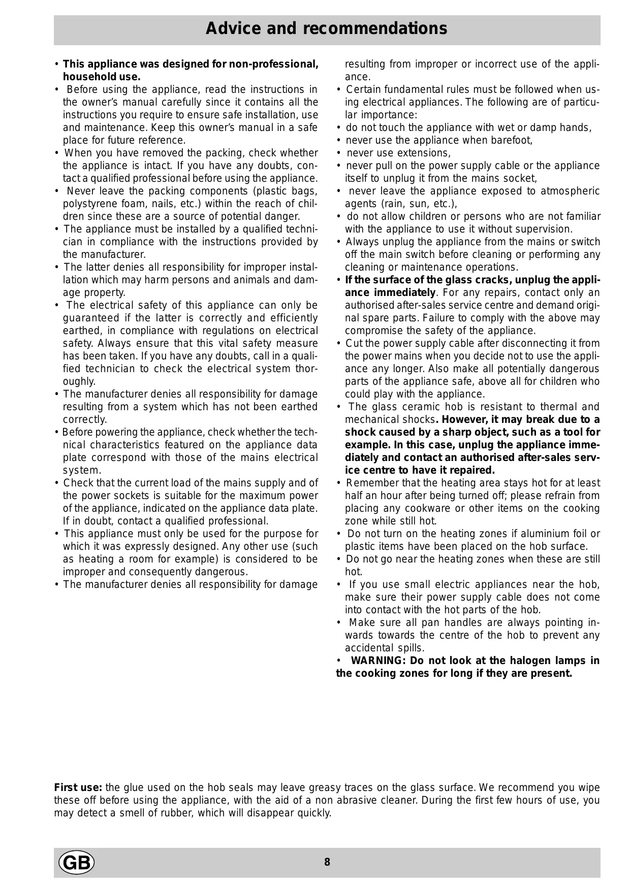 - WARNING: Do not look at the halogen lamps in the cooking zones for long if they are present. First use: the glue used on the hob seals may leave greasy traces on the glass surface. We recommend you wipe these off before using the appliance, with the aid of a non abrasive cleaner. During the first few hours of use, you may detect a smell of rubber, which will disappear quickly.
