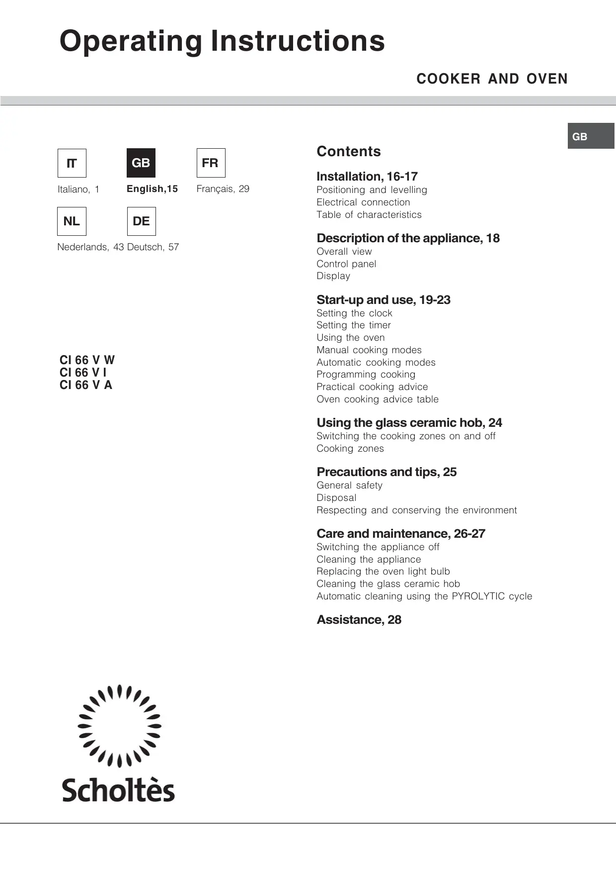 Download the instructions for your Electric oven in PDF format for free! Find your manual CI 66 VW - SCHOLTES and take your electronic device back in hand. On this page are published all the documents necessary for the use of your device. CI 66 VW by SCHOLTES.