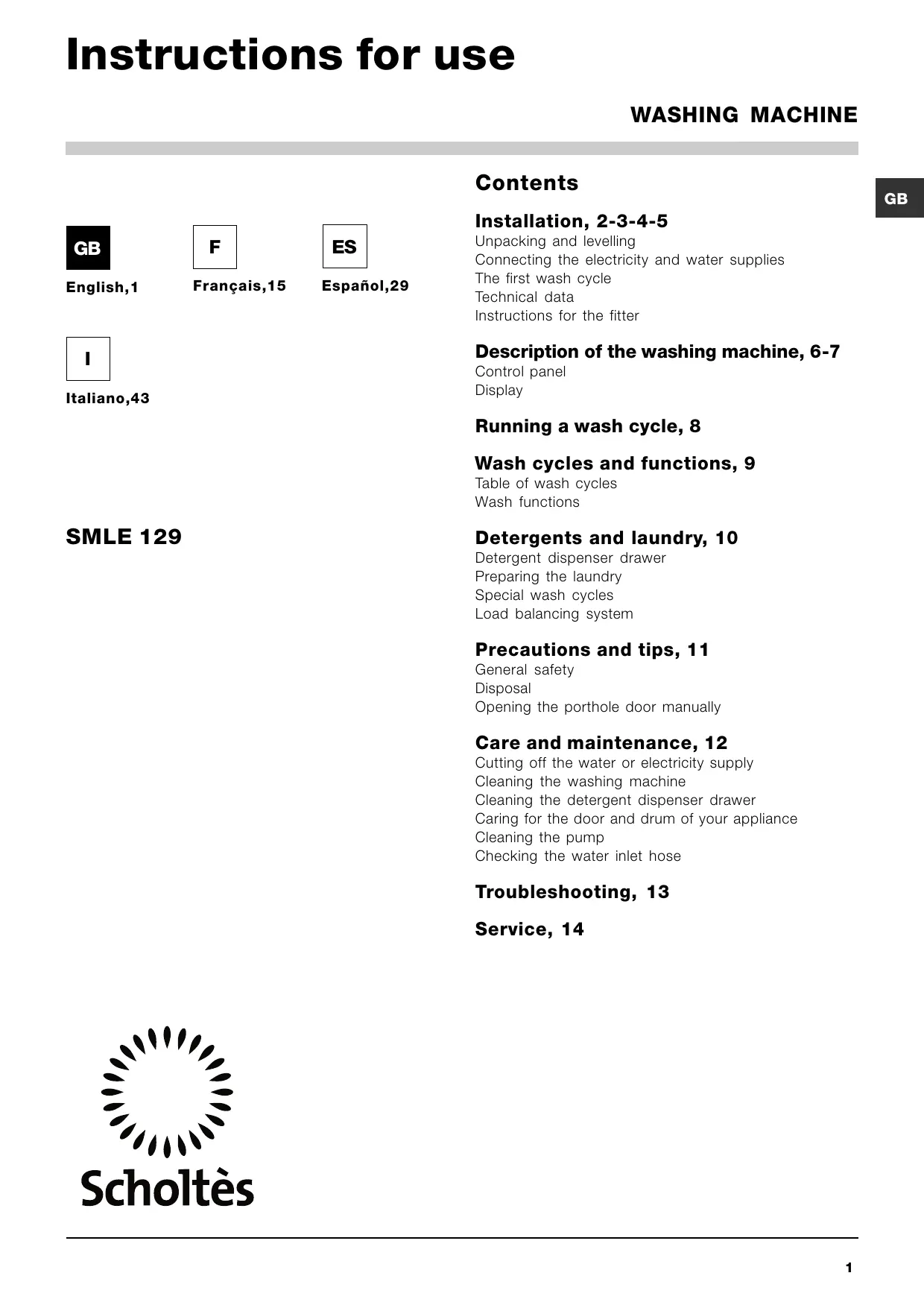 SMLE 129 - Washing machine SCHOLTES - Free user manual and instructions
