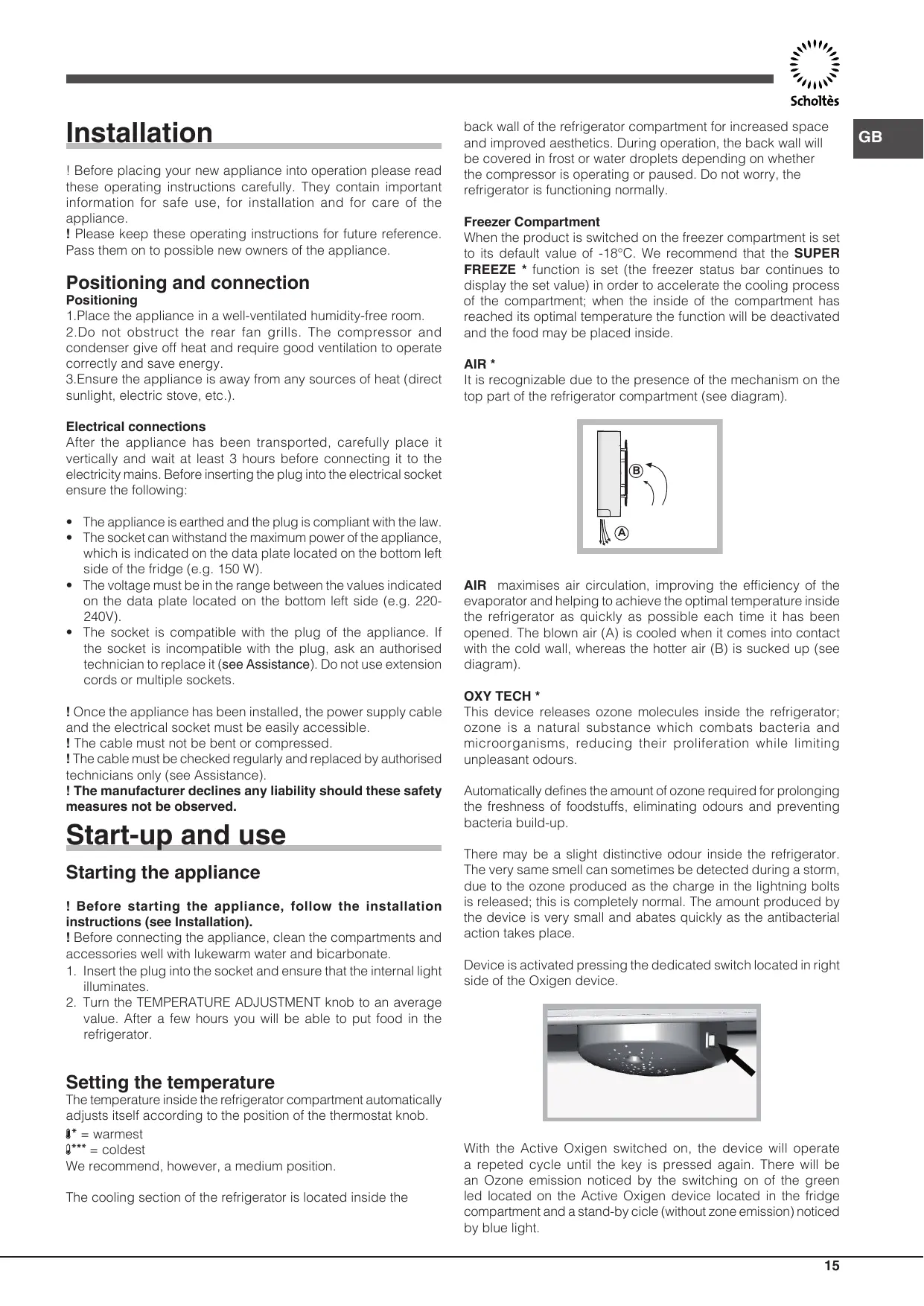 With the Active Oxigen switched on, the device will operate a repeted cycle until the key is pressed again. There will be an Ozone emission noticed by the switching on of the green led located on the Active Oxigen device located in the fridge compartment and a stand-by cicle (without zone emission) noticed by blue light.