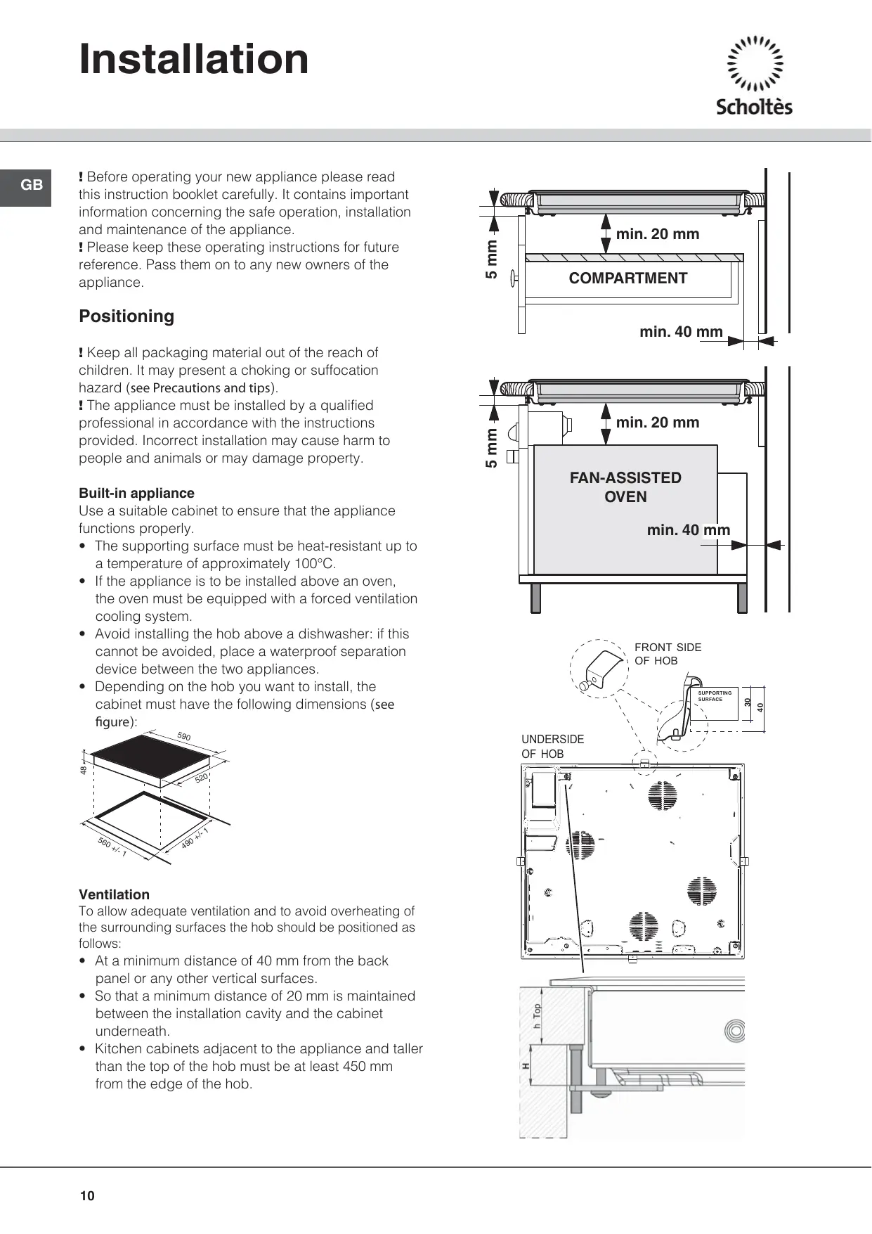 - Depending on the hob you want to install, the cabinet must have the following dimensions (see figure): min. 20 mm 5 mm ! Keep all packaging material out of the reach of children. It may present a choking or suffocation hazard (see Precautions and tips). ! The appliance must be installed by a qualified professional in accordance with the instructions provided. Incorrect installation may cause harm to people and animals or may damage property.
