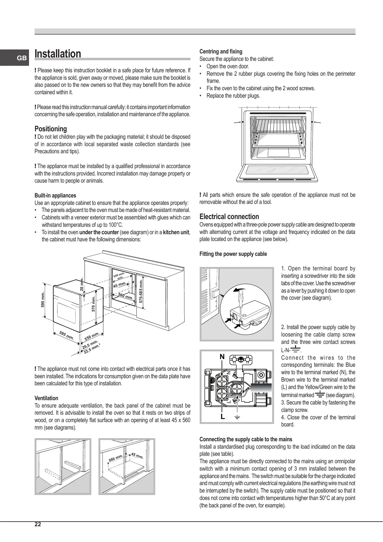 - To install the oven under the counter (see diagram) or in a kitchen unit, the cabinet must have the following dimensions: ! All parts which ensure the safe operation of the appliance must not be removable without the aid of a tool. Electrical connection Ovens equipped with a three-pole power supply cable are designed to operate with alternating current at the voltage and frequency indicated on the data plate located on the appliance (see below). Fitting the power supply cable