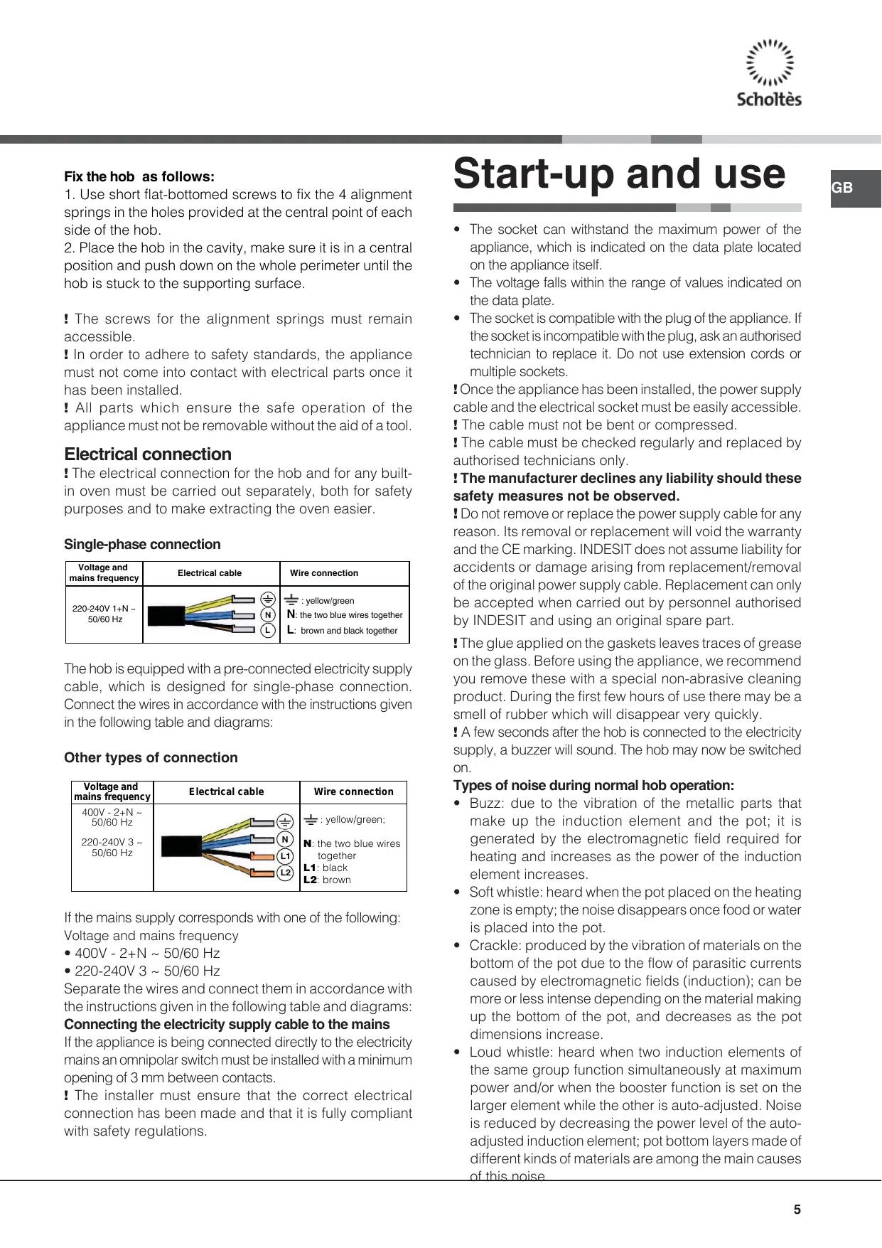position and push down on the whole perimeter until the hob is stuck to the supporting surface. ! The screws for the alignment springs must remain accessible. ! In order to adhere to safety standards, the appliance must not come into contact with electrical parts once it has been installed. ! All parts which ensure the safe operation of the appliance must not be removable without the aid of a tool. Electrical connection ! The electrical connection for the hob and for any built- in oven must be carried out separately, both for safety purposes and to make extracting the oven easier. Single-phase connection Voltage and mains frequency Electrical cable Wire connection : yellow/green 220-240V 1+N ~ 50/60 Hz N: the two blue wires together L: brown and black together The hob is equipped with a pre-connected electricity supply cable, which is designed for single-phase connection. Connect the wires in accordance with the instructions given in the following table and diagrams: Other types of connection Voltage and mains frequency Electrical cable 400V - 2+N ~ 50/60 Hz 220-240V 3 ~ 50/60 Hz Wire connection : yellow/green; N: the two blue wires together L1: black L2: brown If the mains supply corresponds with one of the following: Voltage and mains frequency