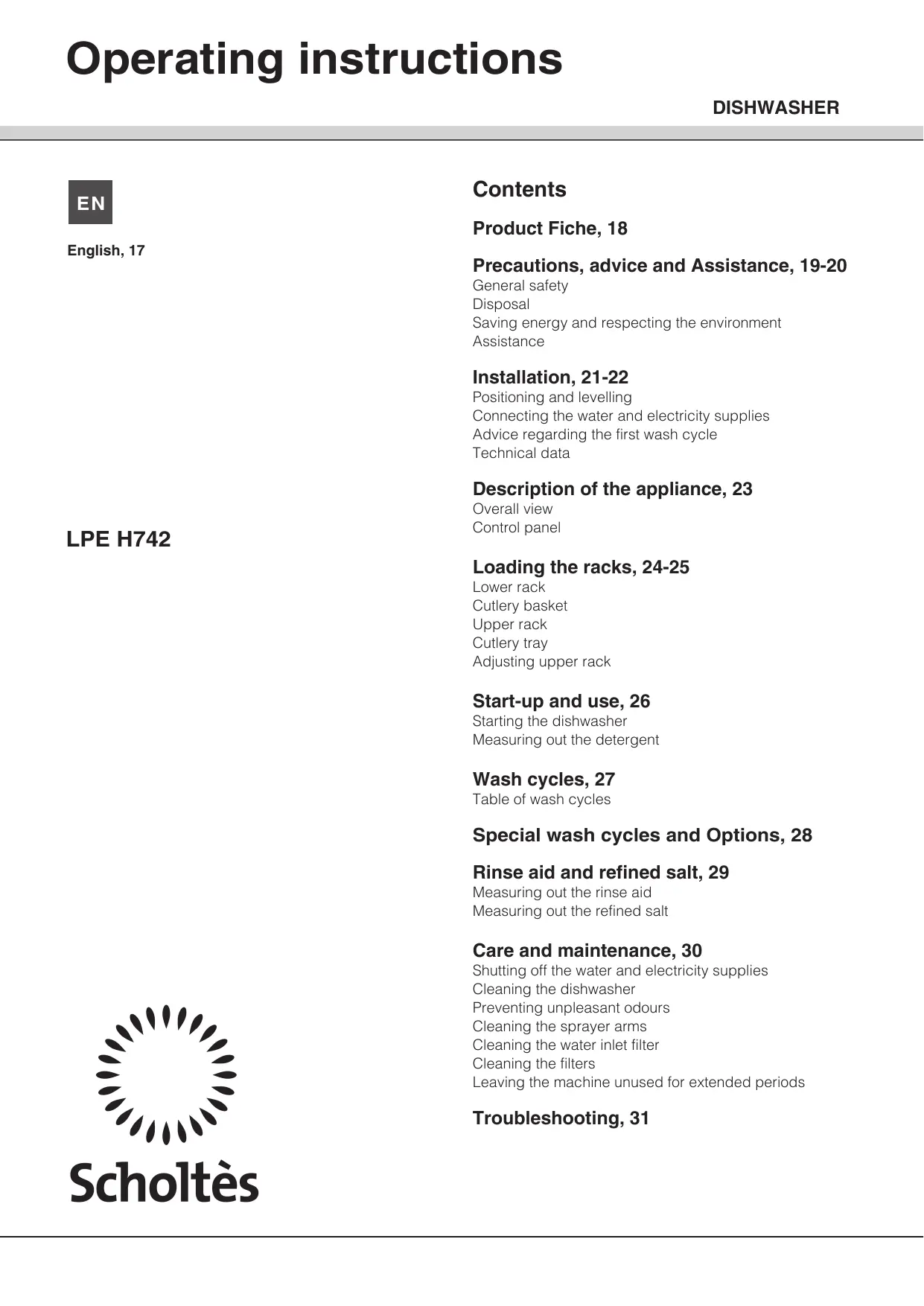 Contents Product Fiche, 18 English, 17 Precautions, advice and Assistance, 19-20 General safety Disposal Saving energy and respecting the environment Assistance Installation, 21-22 Positioning and levelling Connecting the water and electricity supplies Advice regarding the first wash cycle Technical data Description of the appliance, 23 LPE H742 Overall view Control panel Loading the racks, 24-25 Lower rack Cutlery basket Upper rack Cutlery tray Adjusting upper rack Start-up and use, 26 Starting the dishwasher Measuring out the detergent Wash cycles, 27 Table of wash cycles Special wash cycles and Options, 28 Rinse aid and refined salt, 29 Measuring out the rinse aid Measuring out the refined salt Care and maintenance, 30 Shutting off the water and electricity supplies Cleaning the dishwasher Preventing unpleasant odours Cleaning the sprayer arms Cleaning the water inlet filter Cleaning the filters Leaving the machine unused for extended periods Troubleshooting, 31