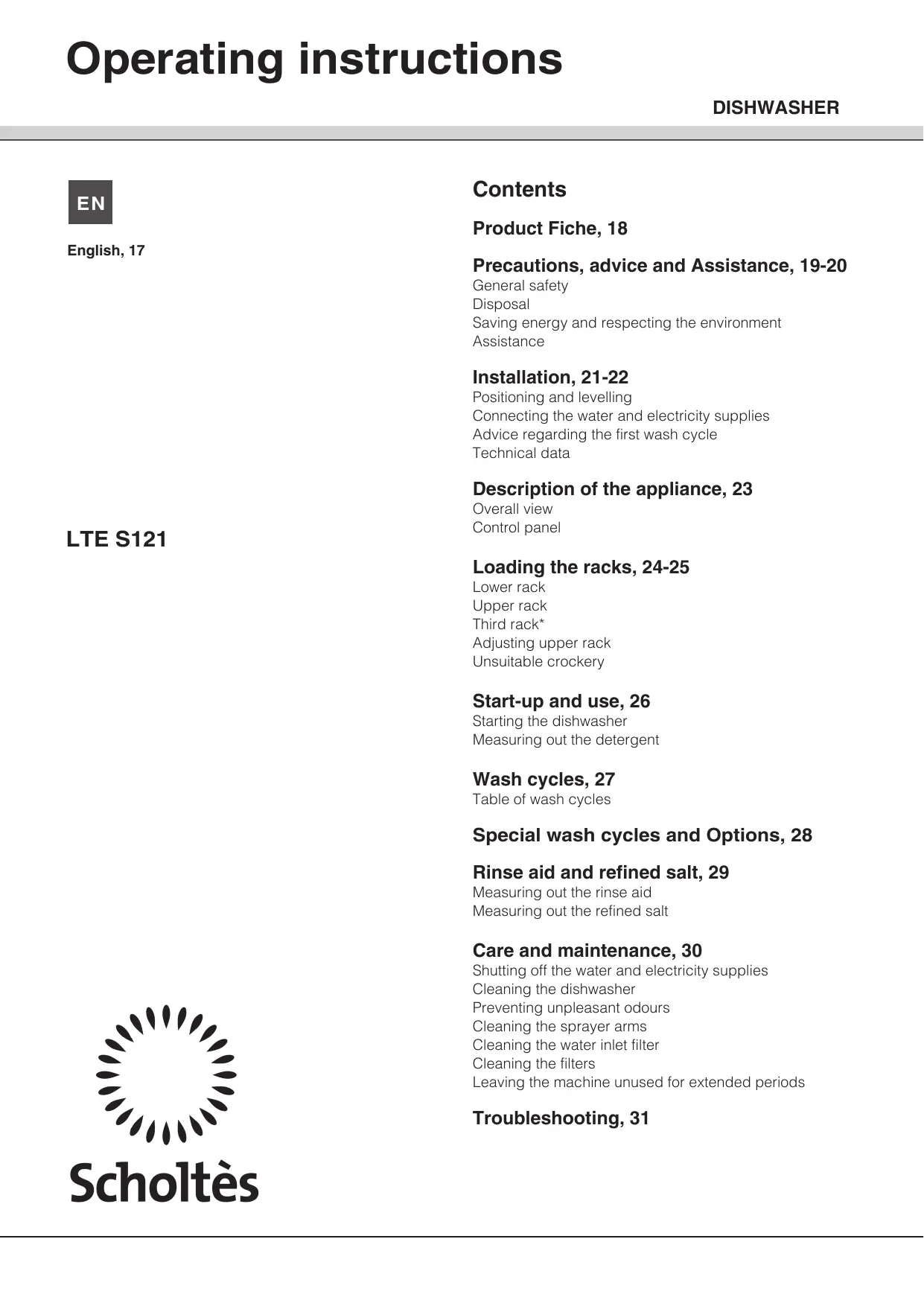 LTE S121 O - Dishwasher SCHOLTES - Free user manual and instructions