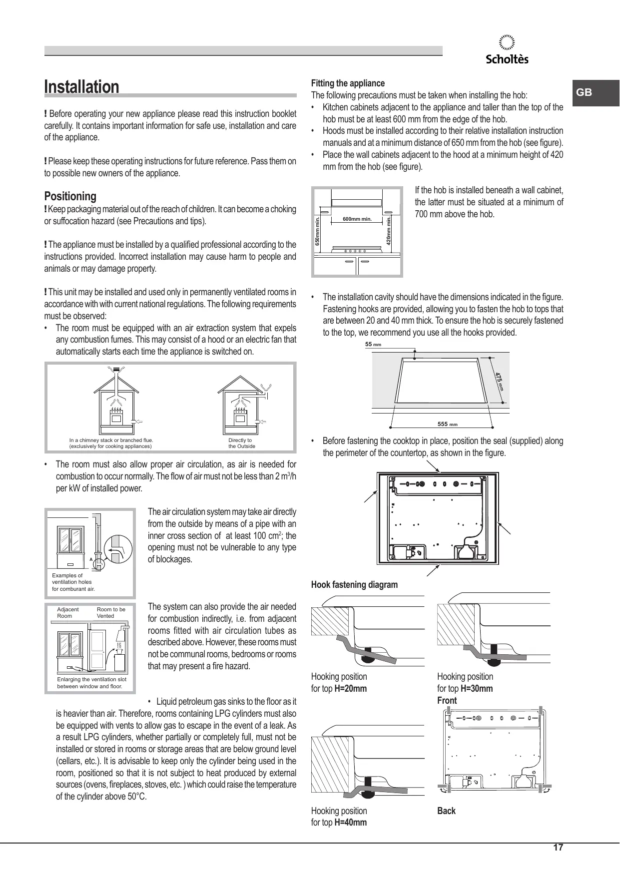 - The room must be equipped with an air extraction system that expels any combustion fumes. This may consist of a hood or an electric fan that automatically starts each time the appliance is switched on. 600mm min. 420mm min. ! Keep packaging material out of the reach of children. It can become a choking or suffocation hazard (see Precautions and tips). 650mm min. Positioning If the hob is installed beneath a wall cabinet, the latter must be situated at a minimum of 700 mm above the hob.