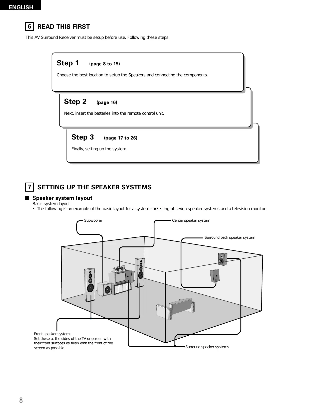 This AV Surround Receiver must be setup before use. Following these steps. Step 1 (page 8 to 15) Choose the best location to setup the Speakers and connecting the components. Step 2 (page 16) Next, insert the batteries into the remote control unit. Step 3 (page 17 to 26) Finally, setting up the system.