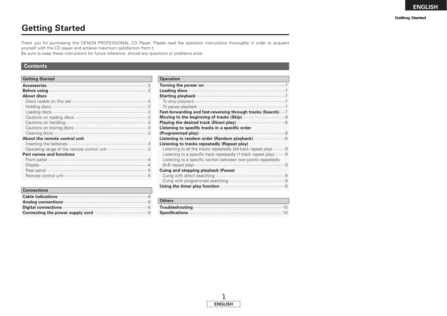 Thank you for purchasing this DENON PROFESSIONAL CD Player. Please read the operation instructions thoroughly in order to acquaint