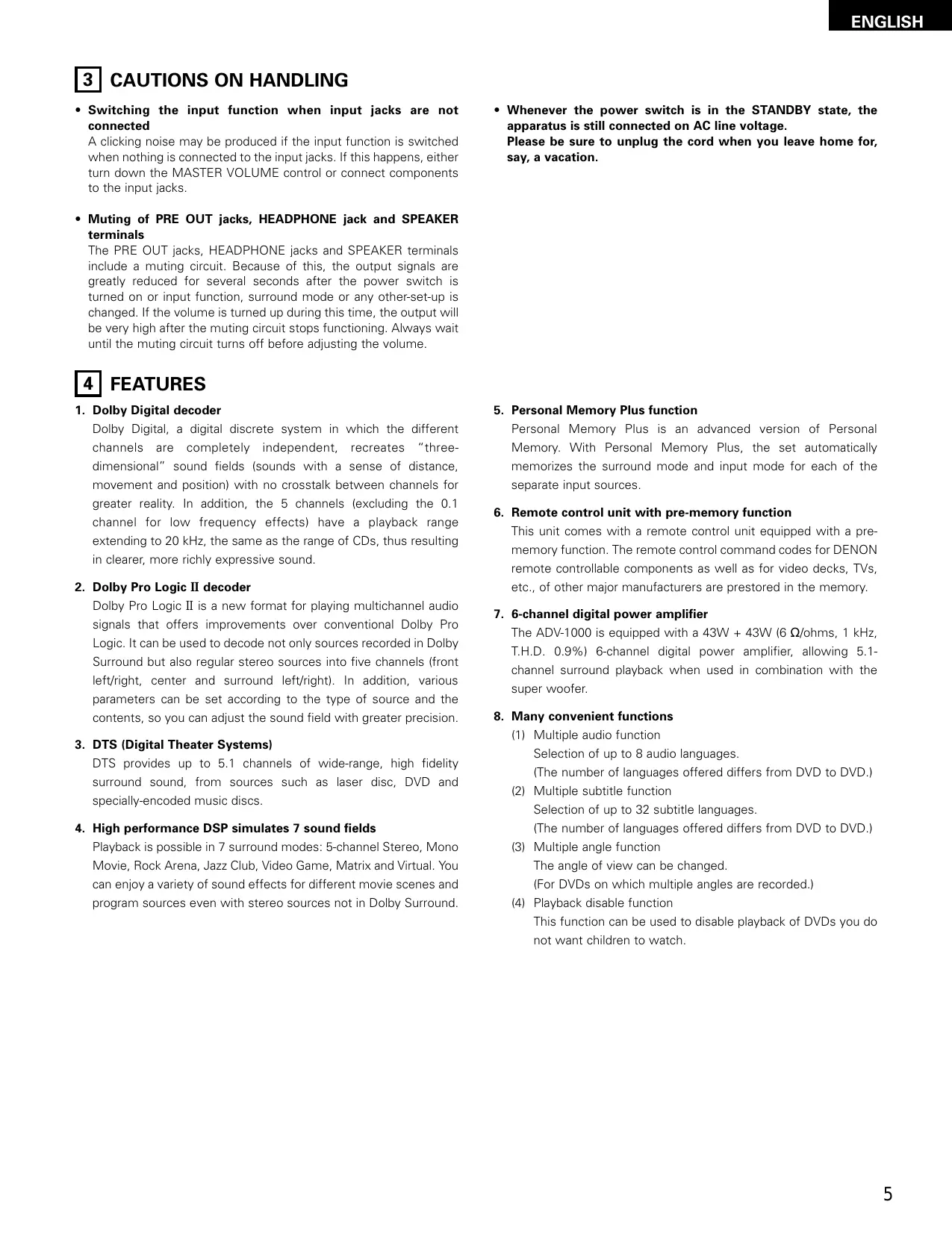 ENGLIS H INTRODUCTION Thank you for choosing the DENON ADV-1000 DVD Surround Receiver. This remarkable component has been engineered to provide superb surround sound listening with home theater sources such as DVD, as well as providing outstanding high fidelity reproduction of your favorite music sources As this product is provided with an immense array of features, we recommend that before you begin hookup and operation that you review the