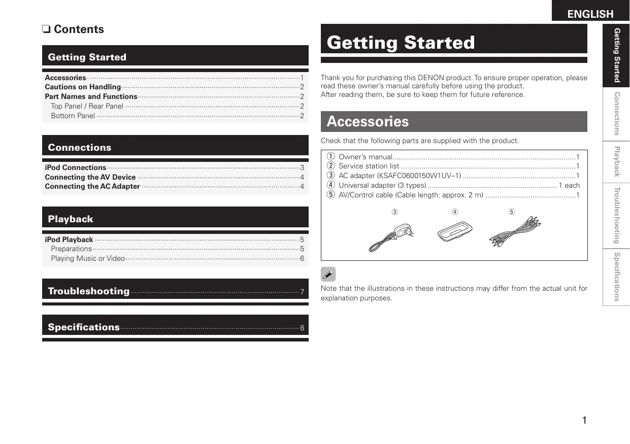 Troubleshooting iPod Connections·······························································································3 Connecting the AV Device················································································4 Connecting the AC Adapter··············································································4 Accessories Playback Connections Thank you for purchasing this DENON product. To ensure proper operation, please read these owner’s manual carefully before using the product. After reading them, be sure to keep them for future reference.