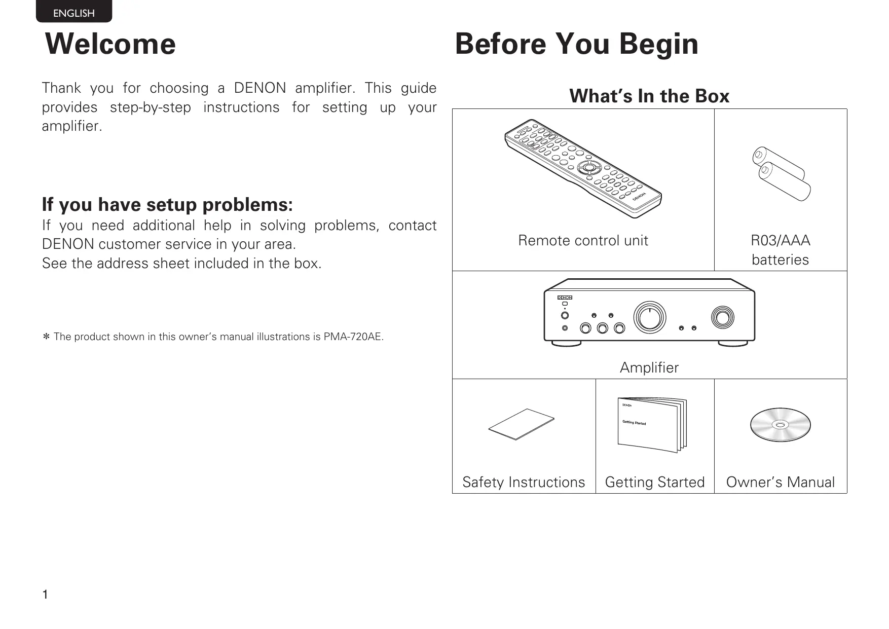 Welcome Before You Begin Thank you for choosing a DENON amplifier. This guide provides step-by-step instructions for setting up your What's In the Box amplifier. If you have setup problems: If you need additional help in solving problems, contact DENON customer service in your area. See the address sheet included in the box. RO3/AAA batteries
