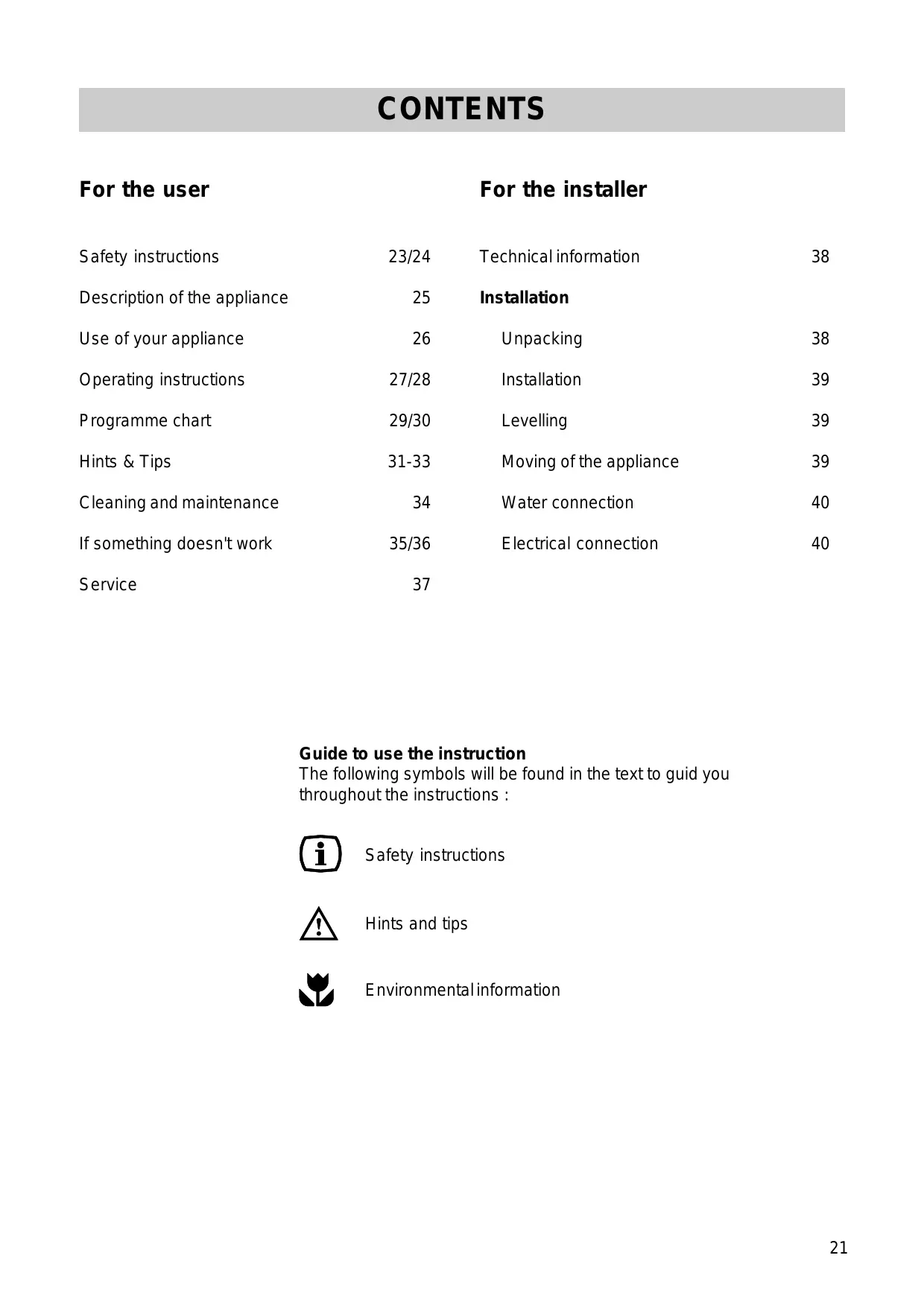 For the user CONTENTS For the installer Safety instructions 23/24 Technical information Description of the appliance 25 Installation Use of your appliance 26 Unpacking Operating instructions 27/28 Installation Programme chart 29/30 Levelling Hints & Tips 31-33 Moving of the appliance Cleaning and maintenance 34 Water connection If something doesn't work 35/36 Electrical connection Service 37 Guide to use the instruction