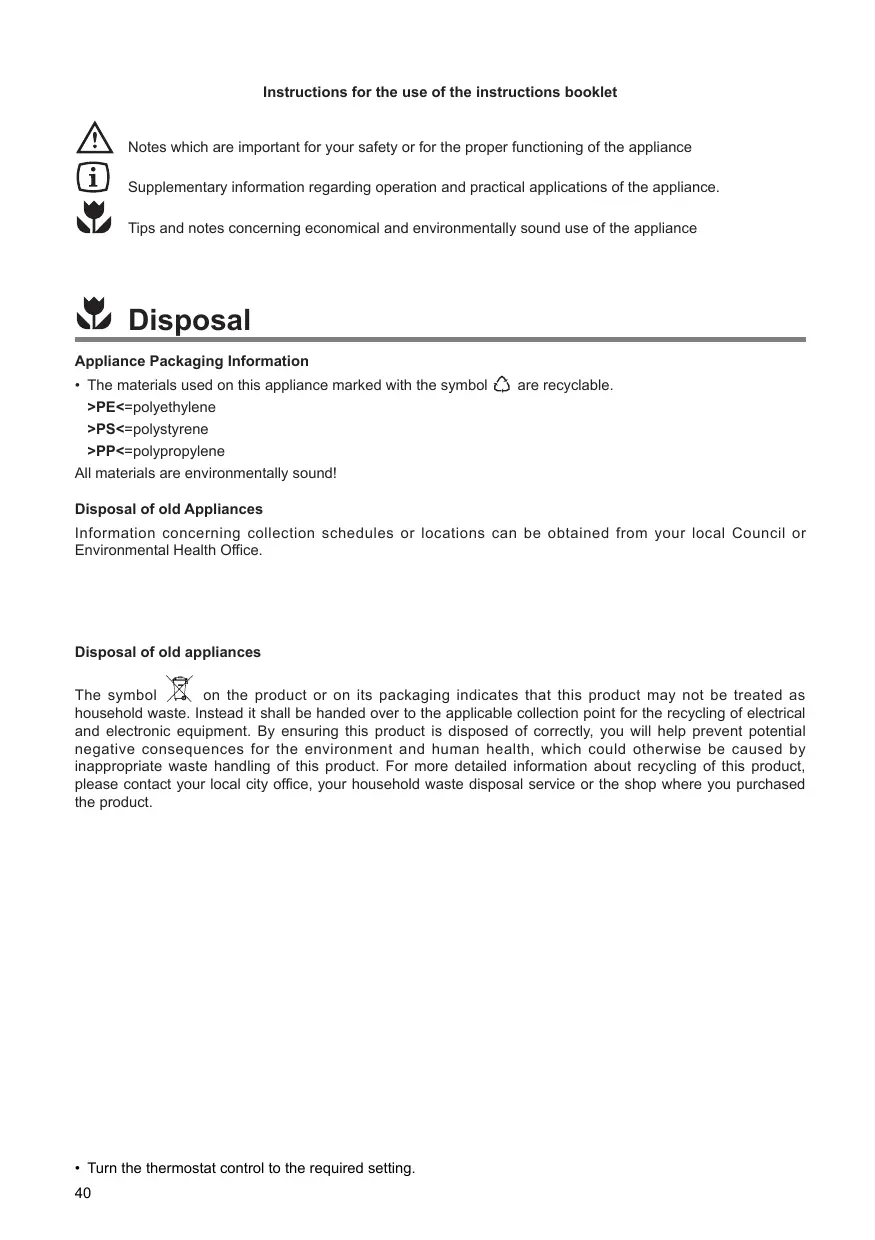¥ Les ŽlŽments de lÕemballage (par ex. sacs, pellicules, polystyr•ne) peuvent •tre dangereux pour les enfants. Ils peuvent sÕŽtouffer! ¥ En cas dÕŽlimination de lÕappareil, couper le c‰ble dÕalimentation et neutraliser le dispositif de fermeture de la porte de mani•re ˆ ce que les enfants ne puissent pas rester enfermŽs ˆ lÕintŽrieur de lÕappareil.