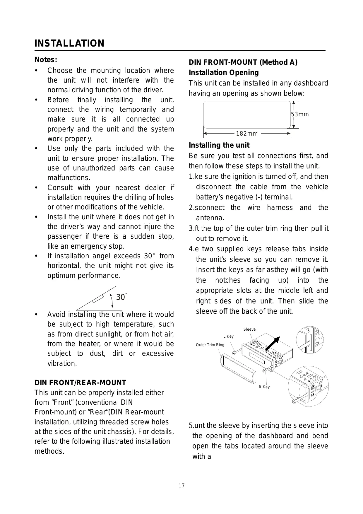 INSTALLATION Notes: Choose the mounting location where the unit will not interfere with the normal driving function of the driver. Before finally installing the unit, connect the wiring temporarily and make sure it is all connected up properly and the unit and the system work properly. Use only the parts included with the unit to ensure proper installation. The use of unauthorized parts can cause malfunctions. Consult with your nearest dealer if installation requires the drilling of holes or other modifications of the vehicle. Install the unit where it does not get in the driver’s way and cannot injure the passenger if there is a sudden stop, like an emergency stop. If installation angel exceeds 30°from horizontal, the unit might not give its optimum performance. DIN FRONT-MOUNT (Method A) Installation Opening This unit can be installed in any dashboard having an opening as shown below: 53mm 182mm Installing the unit Be sure you test all connections first, and then follow these steps to install the unit. 1.ke sure the ignition is turned off, and then disconnect the cable from the vehicle battery’s negative (-) terminal. 2.sconnect the wire harness and the antenna. 3.ft the top of the outer trim ring then pull it out to remove it. 4.e two supplied keys release tabs inside the unit’s sleeve so you can remove it. Insert the keys as far asthey will go (with the notches facing up) into the appropriate slots at the middle left and right sides of the unit. Then slide the sleeve off the back of the unit.