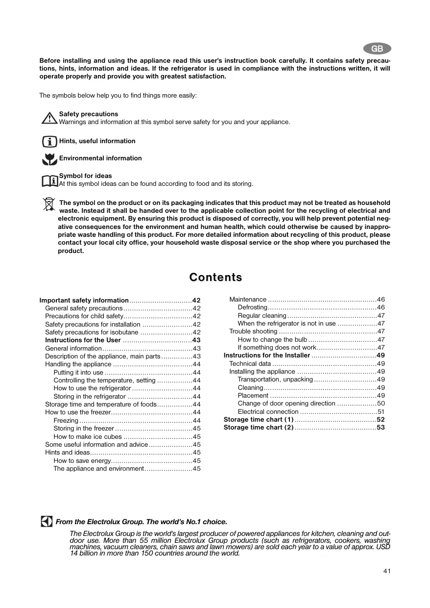 - Before installing and using the appliance read this user's instruction book carefully. It contains safety precautions, hints, information and ideas. If the refrigerator is used in compliance with the instructions written, it will operate properly and provide you with greatest satisfaction. The symbols below help you to find things more easily: Safety precautions Warnings and information at this symbol serve safety for you and your appliance. Hints, useful information Environmental information Symbol for ideas At this symbol ideas can be found according to food and its storing. The symbol on the product or on its packaging indicates that this product may not be treated as household waste. Instead it shall be handed over to the applicable collection point for the recycling of electrical and electronic equipment. By ensuring this product is disposed of correctly, you will help prevent potential negative consequences for the environment and human health, which could otherwise be caused by inappropriate waste handling of this product. For more detailed information about recycling of this product, please contact your local city office, your household waste disposal service or the shop where you purchased the product. Cont ents Important safety information p. 42
