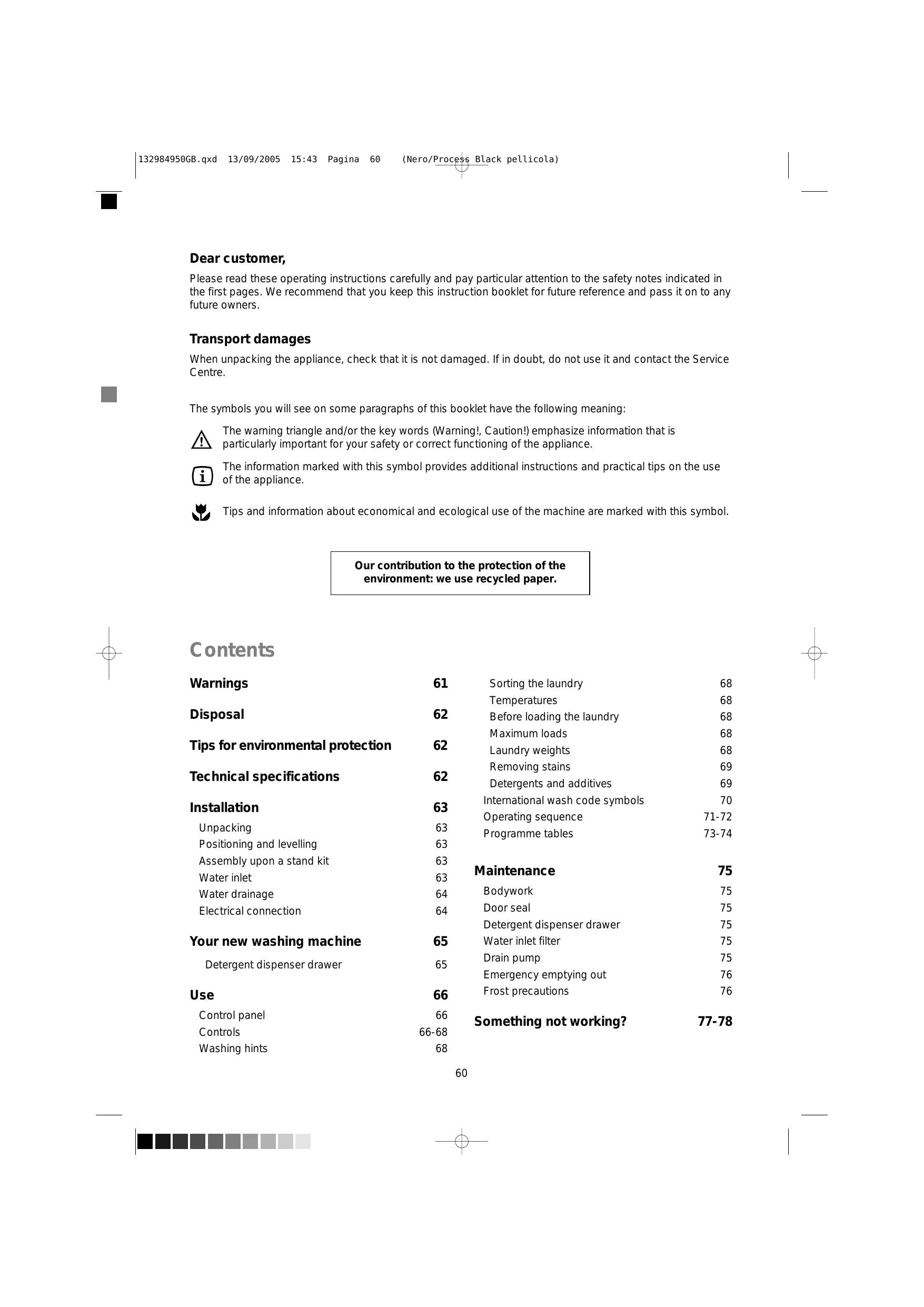 7298255068 13/09/2005 15:43 Pagina 60 (Nero/Process Black pellicola) — D Dear customer, Please read these operating instructions carefully and pay particular attention to the safety notes indicated in the first pages. We recommend that you keep this instruction booklet for future reference and pass it on to any future owners. Transport damages When unpacking the appliance, check that it is not damaged. If in doubt, do not use it and contact the Service Centre. The symbols you will see on some paragraphs of this booklet have the following meaning: The warning triangle and/or the key words (Warning!, Caution!) emphasize information that is VAN particularly important for your safety or correct functioning of the appliance. The information marked with this symbol provides additional instructions and practical tips on the use (F3) of the appliance. Ÿ Tips and information about economical and ecological use of the machine are marked with this symbol. Our contribution to the protection of the environment: we use recycled paper. Contents Warnings 61 Sorting the laundry 68 Temperatures 68 Disposal 62 Before loading the laundry 68 Maximum loads 68 Tips for environmental protection 62 Laundry weights 68 hnical ificati 62 Removing stains 69 Technical specifications Detergents and additives 69 Installation 63 International wash code symbols 70 . Operating sequence 71-72 Unpacking 63 Programme tables 73-74 Positioning and levelling 63 Assembly upon a stand kit 63 . Water inlet 63 Maintenance 75 Water drainage 64 Bodywork 75 Electrical connection 64 Door seal 75 Detergent dispenser drawer 75 Your new washing machine 65 Water inlet filter 75 Detergent dispenser drawer 65 Drain pump 75 Emergency emptying out 76 Use 66 Frost precautions 76 Control panel 66 Something not working? 71-78 Controls 66-68 Washing hints 68