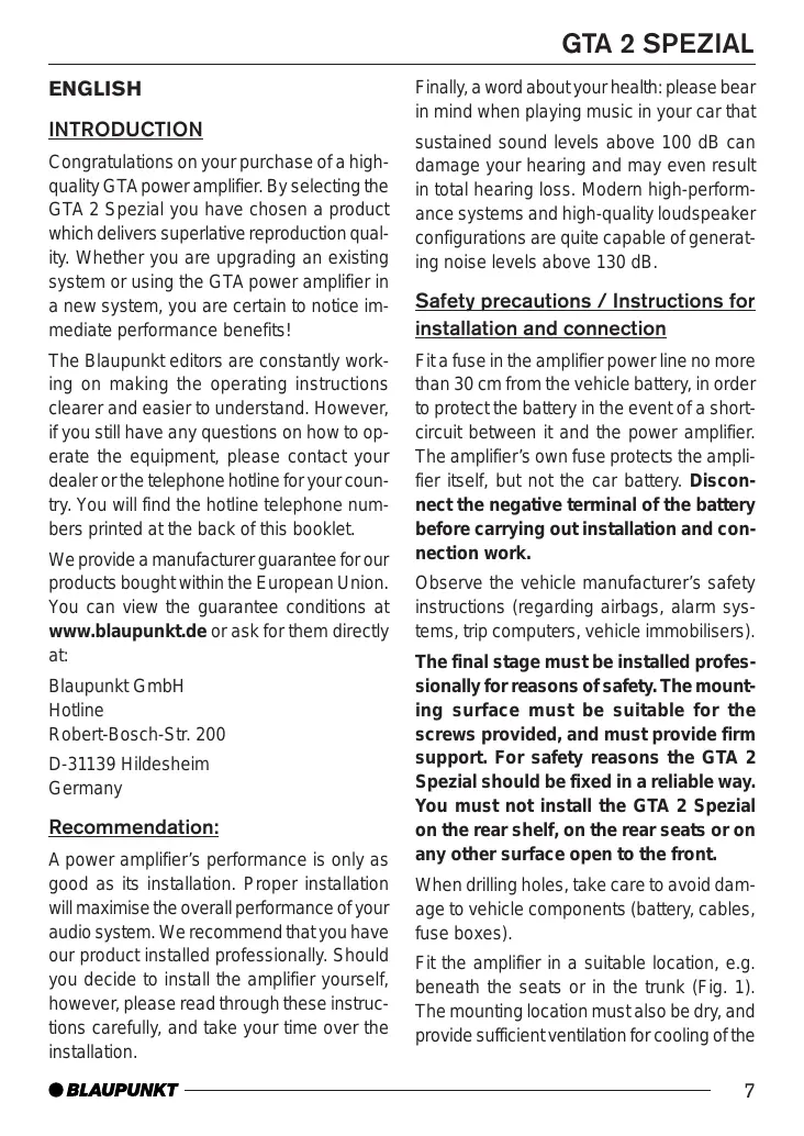 GTA 2 Spezial you have chosen a product which delivers superlative reproduction quality. Whether you are upgrading an existing system or using the GTA power amplifier in a new system, you are certain to notice immediate performance benefits! The Blaupunkt editors are constantly working on making the operating instructions clearer and easier to understand. However, if you still have any questions on how to operate the equipment, please contact your dealer or the telephone hotline for your country. You will find the hotline telephone numbers printed at the back of this booklet. We provide a manufacturer guarantee for our products bought within the European Union. You can view the guarantee conditions at www.blaupunkt.de or ask for them directly at: Blaupunkt GmbH Hotline Robert-Bosch-Str. 200 D-31139 Hildesheim Germany
