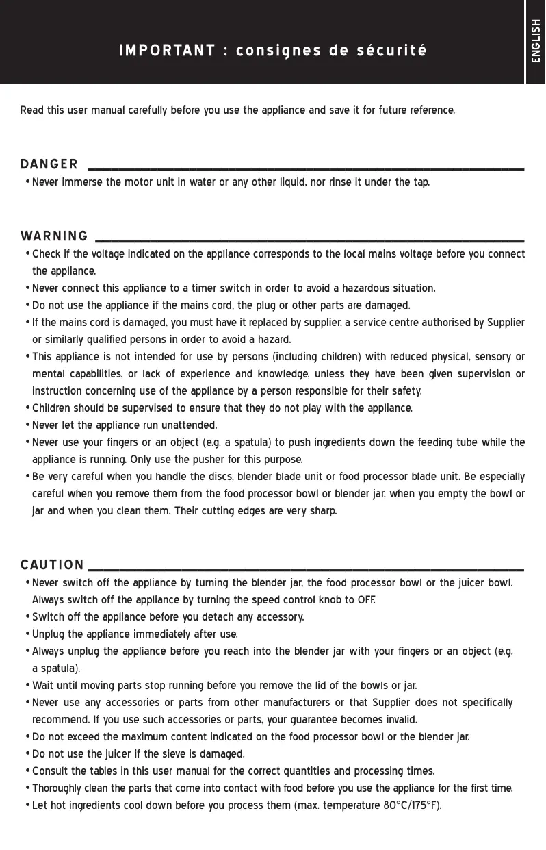 • Ne jamais éteindre l’appareil en dévissant le bol mélangeur, le pétrin du robot ou le mixer. Toujours éteindre l’appareil en mettant le bouton de contrôle de la vitesse sur OFF. • Eteindre l’appareil avant de détacher les accessoires. • Débrancher l’appareil sitôt après la fin d’utilisation. • Toujours débrancher l’appareil avant de manipuler les aliments à l’intérieur du bol mélangeur. • Attendre que les pièces mobiles soient à l’arrêt complet avant de retirer le couvercle du bol ou du pétrin. • Ne jamais utiliser d’accessoires ou pièces détachées d’un autre fabricant ni d’accessoires spécifiquement recommandés par le fournisseur. L’usage de tels accessoires ou pièces annule la garantie. • Ne pas dépasser le repère de remplissage maximum indiqué sur le robot ou le bol. • Ne pas utiliser le presse-agrumes si la passoire est abimée. • Se référer aux tableaux du présent manuel pour les quantités et durée de préparation. • Nettoyer complètement les pièces en contact avec les aliments avant la première utilisation de l’appareil. • Faire refroidir les aliments chauds avant de les introduire dans l’appareil (température max. 80°C/175°F).