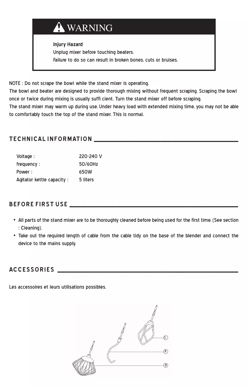 WARNING Injury Hazard Unplug mixer before touching beaters. Failure to do so can result in broken bones, cuts or bruises. NOTE : Do not scrape the bowl while the stand mixer is operating. The bowl and beater are designed to provide thorough mixing without frequent scraping. Scraping the bowl once or twice during mixing is usually suffi cient. Turn the stand mixer off before scraping. The stand mixer may warm up during use. Under heavy load with extended mixing time, you may not be able to comfortably touch the top of the stand mixer. This is normal. Technical information _________________________________________ Voltage : frequency : Power : Agitator kettle capacity : 220-240 V 50/60Hz 650W 5 liters Before first use ________________________________________________