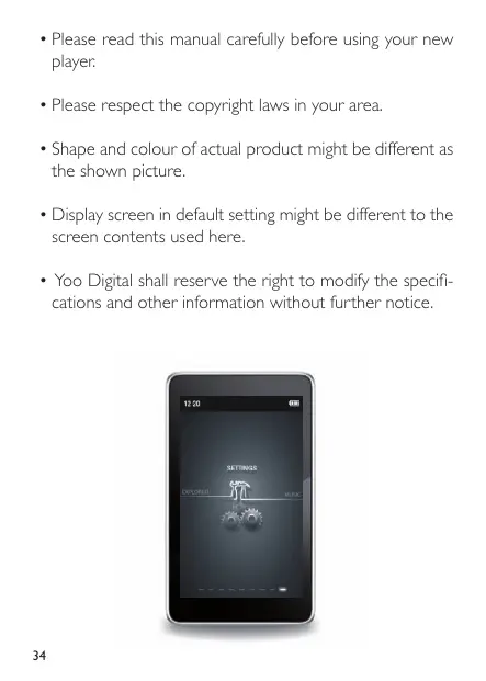 • Please read this manual carefully before using your new player. • Please respect the copyright laws in your area. • Shape and colour of actual product might be different as the shown picture. • Display screen in default setting might be different to the screen contents used here. • Yoo Digital shall reserve the right to modify the specifications and other information without further notice.
