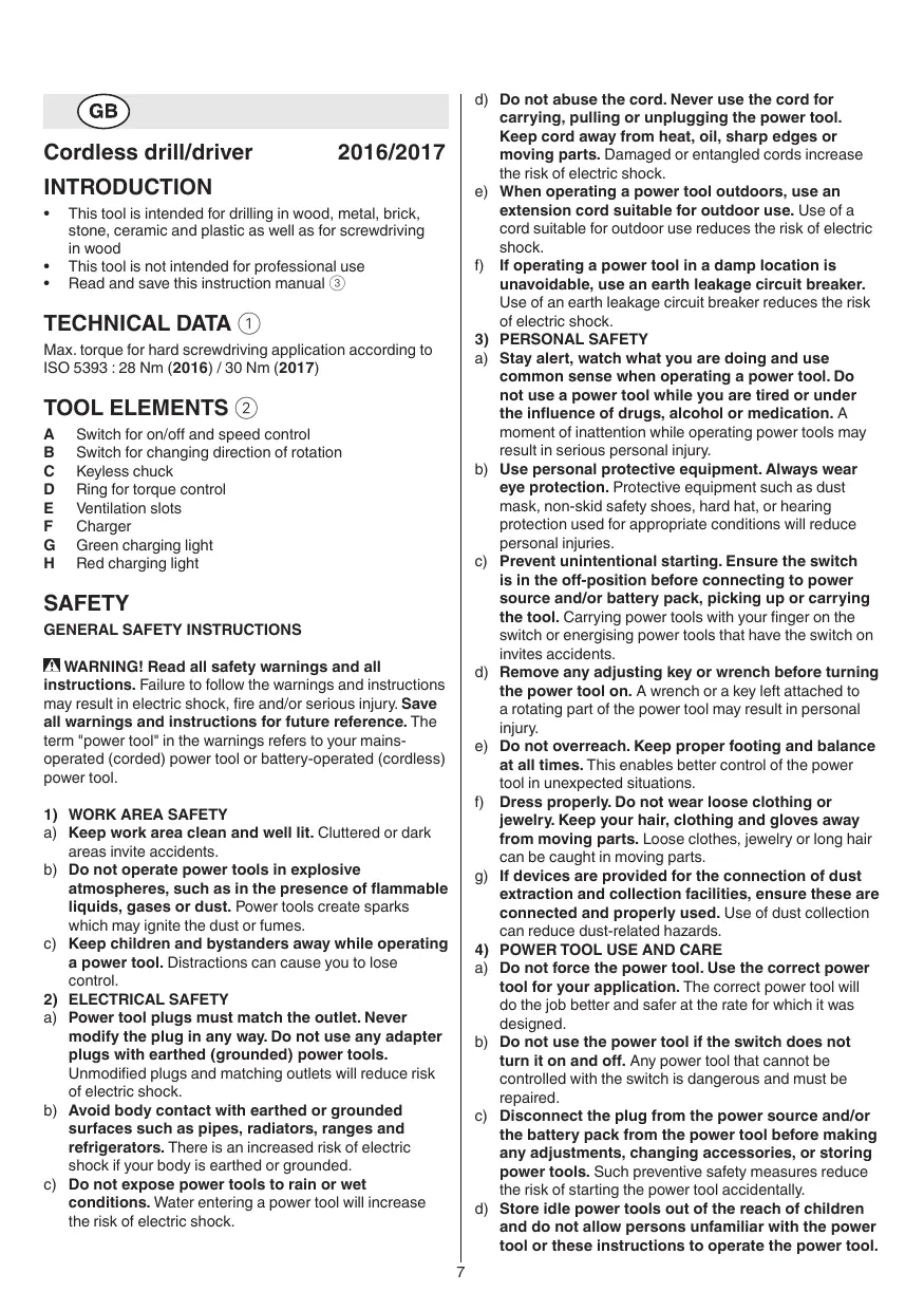 -- battery of new tools is not fully charged -- connect charger to power source as illustrated -- green light G will turn on indicating that the charger is ready for operation -- insert battery into charger -- red light H will turn on indicating that the battery is being charged -- charge the battery for at least 5 hours, after which the battery may be used even though the red light may still be on (the red light may require more than 5 hours to turn off) !! remove battery from charger after charging period has ended thereby lengthening the service life of the battery IMPORTANT: -- while charging, the charger and the battery may become warm to touch; this is normal and does not indicate a problem -- ensure that the outside surface of the battery is clean and dry before inserting into charger -- do not charge at temperatures below 0°C and over 40°C; this will seriously damage the battery as well as the charger -- do not remove battery from tool while it is running !! a battery that is new or has not been used for a longer period does not develop its full capacity until after approximately 5 charging/discharging cycles -- do not repeatedly recharge the battery after only a few minutes of operation; this may result in a reduction of operating time and battery efficiency -- if you anticipate long periods of non-use for the tool, it is best to unplug the charger from its power source On/off e Speed control for smooth starting r Changing direction of rotation t -- when not properly set in left/right position, switch A 2 cannot be activated !! change direction of rotation only when tool is at a complete standstill Changing bits y -- insert the bit as deep as possible in the chuck !! do not use bits with a damaged shank Torque control (VariTorque) u -- limits the amount of output torque delivered by the chuck (21 clutch settings) -- when turning in a screw, first try VariTorque position 1 and increase until the desired depth has been reached Holding and guiding the tool i !! while working, always hold the tool at the greycoloured grip area(s) -- keep ventilation slots E 2 uncovered -- do not apply too much pressure on the tool; let the tool do the work for you