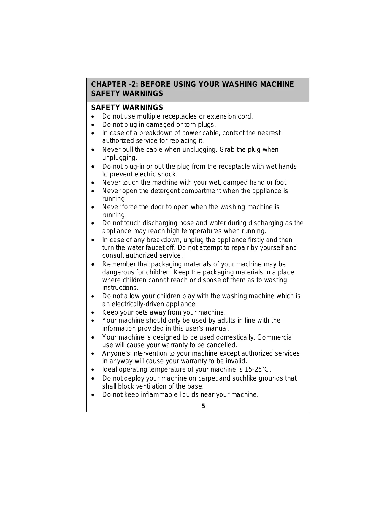 CHAPTER -2: BEFORE USING YOUR WASHING MACHINE SAFETY WARNINGS SAFETY WARNINGS + Do notuse multiple receptacles or extension cord. ° __ Do not plug in damaged or torn plugs. ° In case of a breakdown of power cable, contactthe nearest authorized service for replacing it. + __ Never pullthe cable when unplugging. Grab the plug when unplugging. ° Do not plug-in or outthe plug from the receptacle with wet hands to prevent electric shock. + __ Never touch the machine with your wet, damped hand or foot. + Never open the detergent compartment when the appliance is running. + __ Never force the door to open when the washing machine is running. + __ Do nottouch discharging hose and water during discharging as the appliance may reach high temperatures when running. ° In case of any breakdown, unplug the appliance firstly and then turn the water faucet off. Do not attempt to repair by yourself and consult authorized service. + __ Remember that packaging materials of your machine may be dangerous for children. Keep the packaging materials in a place where children cannot reach or dispose of them as to wasting instructions. + __ Do notallow your children play with the washing machine which is an electrically-driven appliance. + Keep your pets away from your machine. + __ Your machine should only be used by adults in line with the information provided in this user's manual. e Your machine is designed to be used domestically. Commercial use will cause your warranty to be cancelled. ° _ Anyone's intervention to your machine except authorized services in anyway will cause your warranty to be invalid. + Ideal operating temperature of your machine is 15-25°C. ° Do not deploy your machine on carpet and suchlike grounds that shall block ventilation of the base. + Do not keep inflammable liquids near your machine.