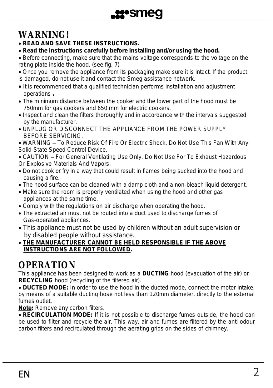 The hood packaging includes, together with this operating and maintenance booklet, the Smeg Warranty Booklet. Please read the Smeg Warranty Booklet for complete information about the warranty (N.B. bulbs and filters are not covered by your warranty).