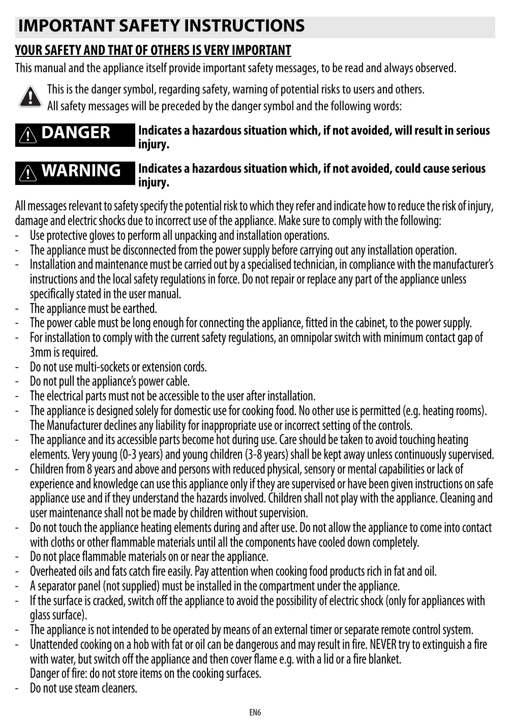 YOUR SAFETY AND THAT OF OTHERS IS VERY IMPORTANT This manual and the appliance itself provide important safety messages, to be read and always observed. À This is the danger symbol, regarding safety, warning of potential risks to users and others. “% Al safety messages will be preceded by the danger symbol and the following words: /\ DANGER Indicates a hazardous situation which, if not avoided, will result in serious — injury. PMU NTIC Indicates a hazardous situation which, if not avoided, could cause serious ns injury. Allmessages relevant to safety specify the potential risk to which they refer and indicate how to reduce the risk ofinjury, damage and electric shocks due to incorrect use ofthe appliance. Make sure to comply with the following: = Use protective gloves to perform all unpacking and installation operations. - The appliance must be disconnected from the power supply before carrying out any installation operation. - Installation and maintenance must be carried out by a specialised technician, in compliance with the manufacturers instructions and the local safety regulations in force. Do not repair or replace any part ofthe appliance unless specifically stated in the user manual. - The appliance must be earthed. - The power cable must be long enough for connecting the appliance, fitted in the cabinet, to the power supply. = Forinstallation to comply with the current safety regulations, an omnipolar switch with minimum contact gap of 3mm is required. = Donotuse multi-sockets or extension cords. = Donot pull the appliance's power cable. - The electrical parts must not be accessible to the user after installation. - The appliance is designed solely for domestic use for cooking food. No other use is permitted (e.g. heating rooms). The Manufacturer dedlines any liability for inappropriate use or incorrect setting of the controls. - The appliance and its accessible parts become hot during use. Care should be taken to avoid touching heating elements. Very young (0-3 years) and young children (3-8 years) shall be kept away unless continuously supervised. = Children from 8 years and above and persons with reduced physical, sensory or mental capabilities or lack of experience and knowledge can use this appliance only ifthey are supervised or have been given instructions on safe appliance use and if they understand the hazards involved. Children shall not play with the appliance. Cleaning and user maintenance shall not be made by children without supervision. - Donottouchthe appliance heating elements during and after use. Do not allow the appliance to come into contact With dloths or other flammable materials until all the components have cooled down completely. = Donot place flammable materials on or near the appliance. - Overheated oils and fats catch ire easily. Pay attention when cooking food products rich in fat and oil. = Aseparator panel (not supplied) must be installed in the compartment under the appliance. = Ifthe surface is cracked, switch off the appliance to avoid the possibility of electric shock (only for appliances with glass surface). - The appliance is not intended to be operated by means of an external timer or separate remote control system. - Unattended cooking on a hob with fat or oil can be dangerous and may result in fire. NEVER try to extinguish a fire With water, but switch offthe appliance and then cover flame e.g. with a lid or a fire blanket. Danger of fire: do not store items on the cooking surfaces. = Donot use steam cleaners. EN6