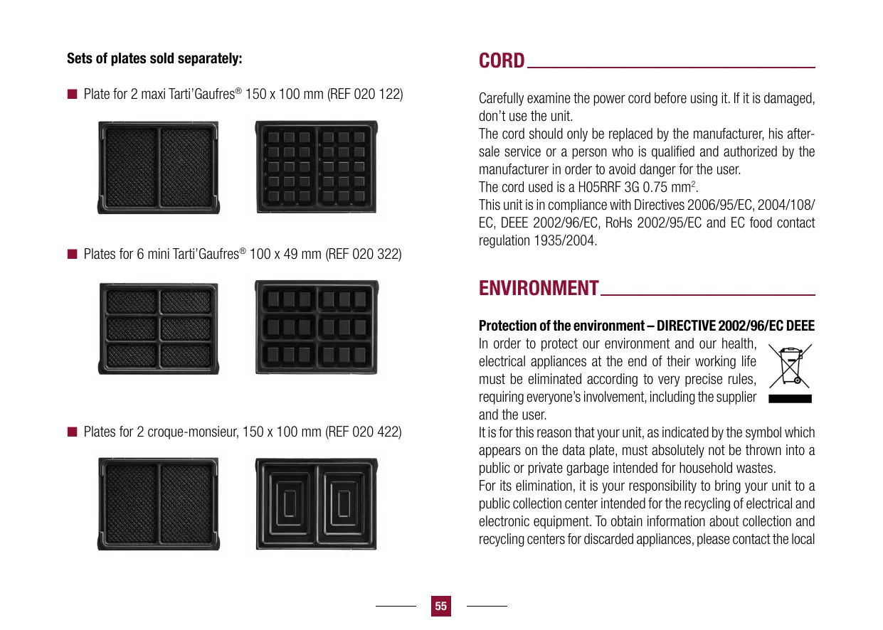 The cord should only be replaced by the manufacturer, his aftersale service or a person who is qualified and authorized by the manufacturer in order to avoid danger for the user. The cord used is a H05RRF 3G 0.75 mm2. This unit is in compliance with Directives 2006/95/EC, 2004/108/ EC, DEEE 2002/96/EC, RoHs 2002/95/EC and EC food contact regulation 1935/2004.