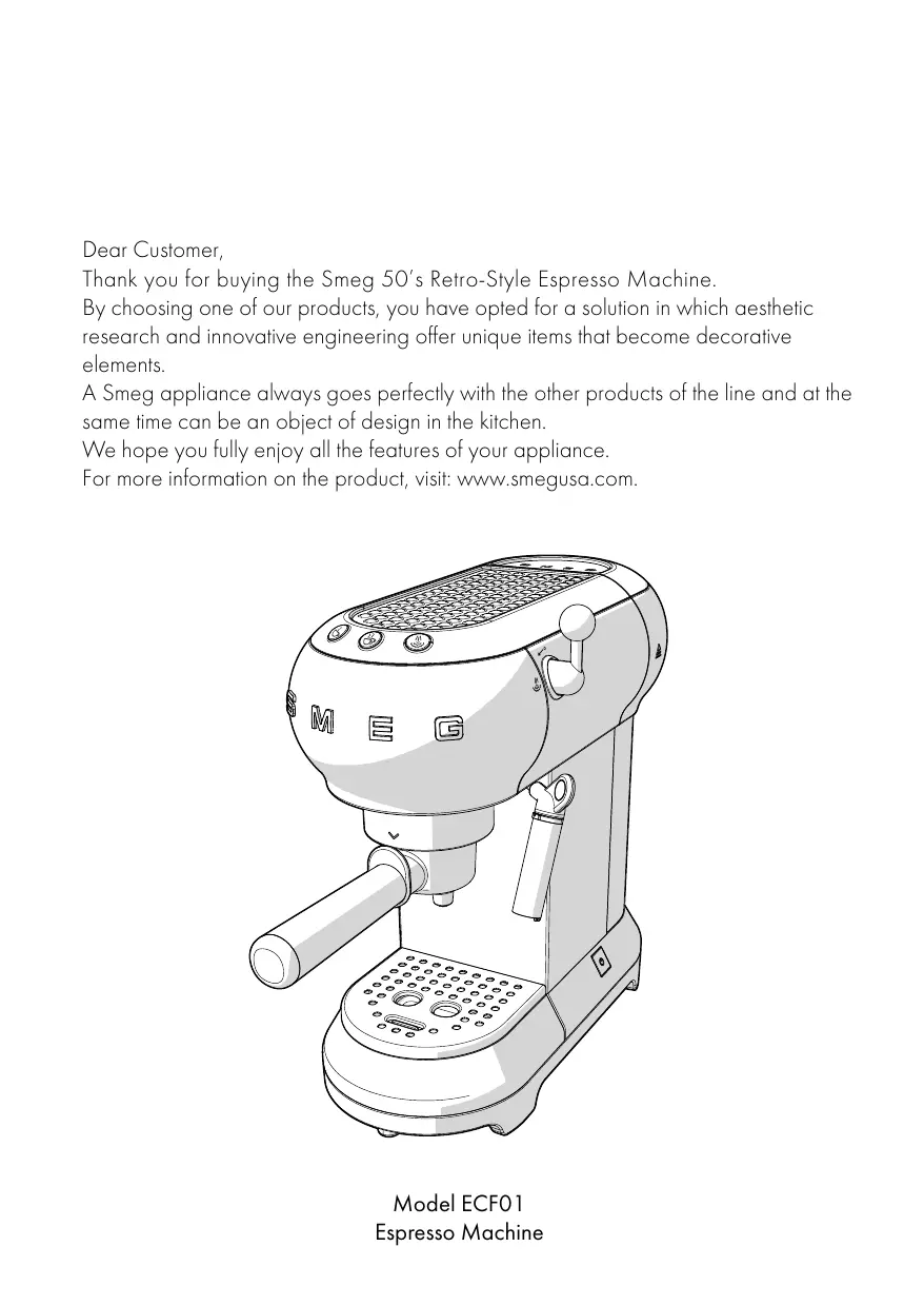 Dear Customer, Thank you for buying the Smeg 50's Retro-Style Espresso Machine. By choosing one of our products, you have opted for a solution in which aesthetic research and innovative engineering offer unique items that become decorative elements. À Smeg appliance always goes perfecily with the other products of the line and at the same lime can be an object of design in the kitchen We hope you fully enjoy all the features of your appliance. For more information on the product, visit: www.smegusa.com Model ECFO1 Espresso Machine