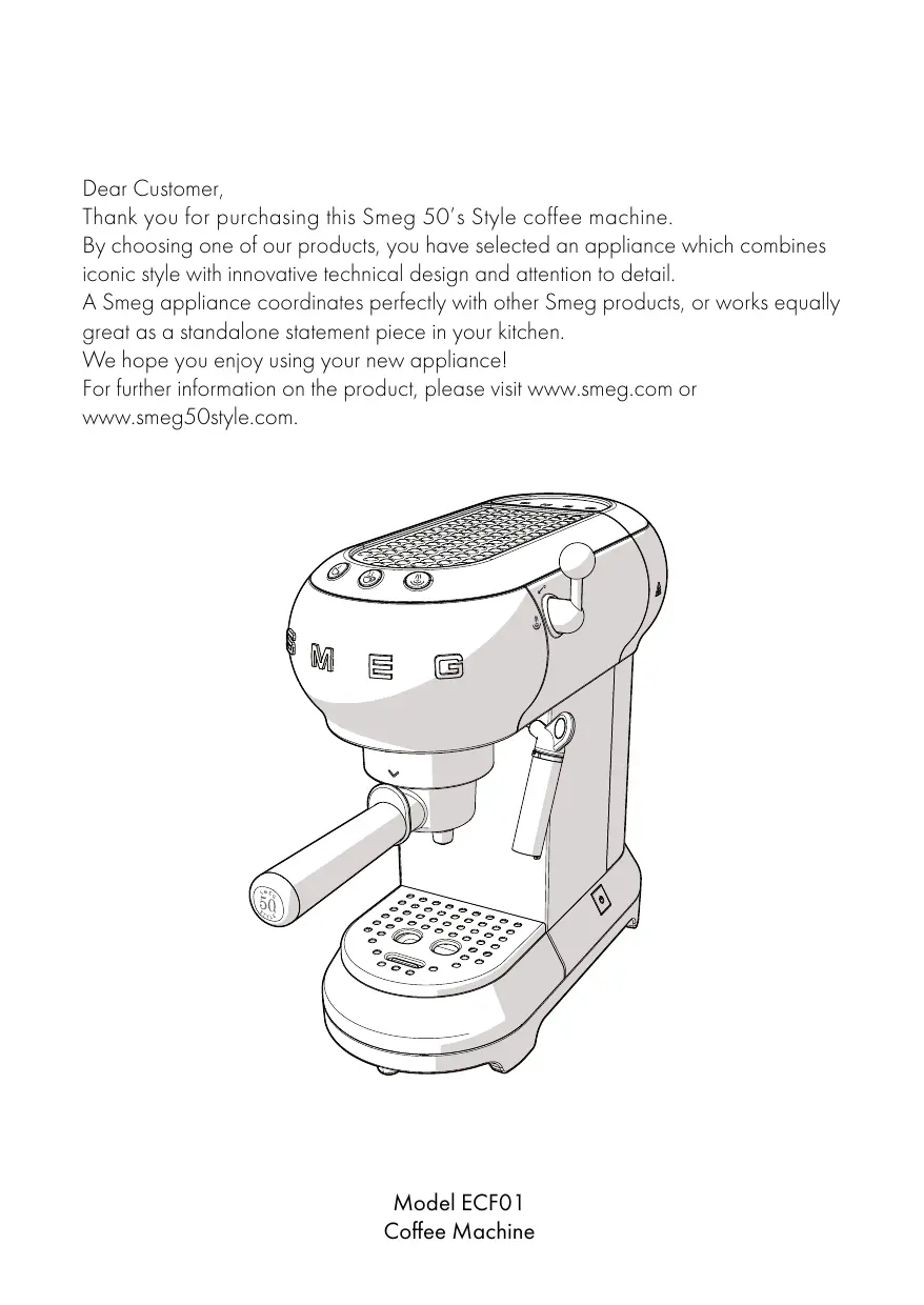 Dear Customer, Thank you for purchasing this Smeg 50's Style coffee machine. By choosing one of our products, you have selected an appliance which combines iconic style with innovative technical design and attention to detail A Smeg appliance coordinates perfectly with other Smeg products, or works equally great as a standalone statement piece in your kitchen. We hope you enjoy using your new appliancel For further information on the product, please visit www.smeg.com or www.smegS50Ostyle.com Model ECFO1 Coffee Machine