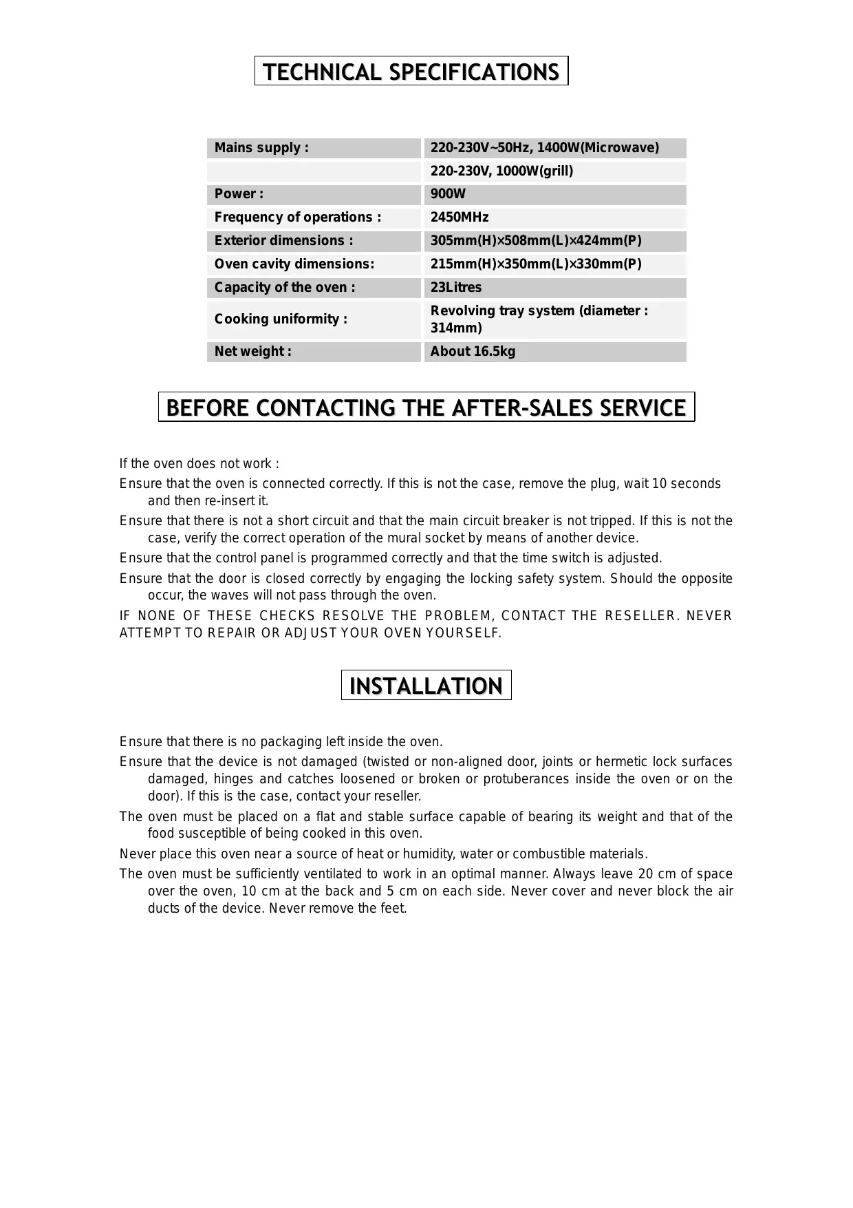 If the oven does not work : Ensure that the oven is connected correctly. If this is not the case, remove the plug, wait 10 seconds and then re-insert it. Ensure that there is not a short circuit and that the main circuit breaker is not tripped. If this is not the case, verify the correct operation of the mural socket by means of another device. Ensure that the control panel is programmed correctly and that the time switch is adjusted. Ensure that the door is closed correctly by engaging the locking safety system. Should the opposite occur, the waves will not pass through the oven. IF NONE OF THESE CHECKS RESOLVE THE PROBLEM, CONTACT THE RESELLER. NEVER ATTEMPT TO REPAIR OR ADJUST YOUR OVEN YOURSELF. INSTALLATION Ensure that there is no packaging left inside the oven. Ensure that the device is not damaged (twisted or non-aligned door, joints or hermetic lock surfaces damaged, hinges and catches loosened or broken or protuberances inside the oven or on the door). If this is the case, contact your reseller. The oven must be placed on a flat and stable surface capable of bearing its weight and that of the food susceptible of being cooked in this oven. Never place this oven near a source of heat or humidity, water or combustible materials. The oven must be sufficiently ventilated to work in an optimal manner. Always leave 20 cm of space over the oven, 10 cm at the back and 5 cm on each side. Never cover and never block the air ducts of the device. Never remove the feet. Never use the oven without the tray, its support and the drive axle being correctly installed. Ensure that the supply lead is not damaged and that it does not wander below the oven or onto any other hot or sharp surface. The plug must always remain accessible to be able to be disconnected easily in the case of an emergency. Never use this oven outside.