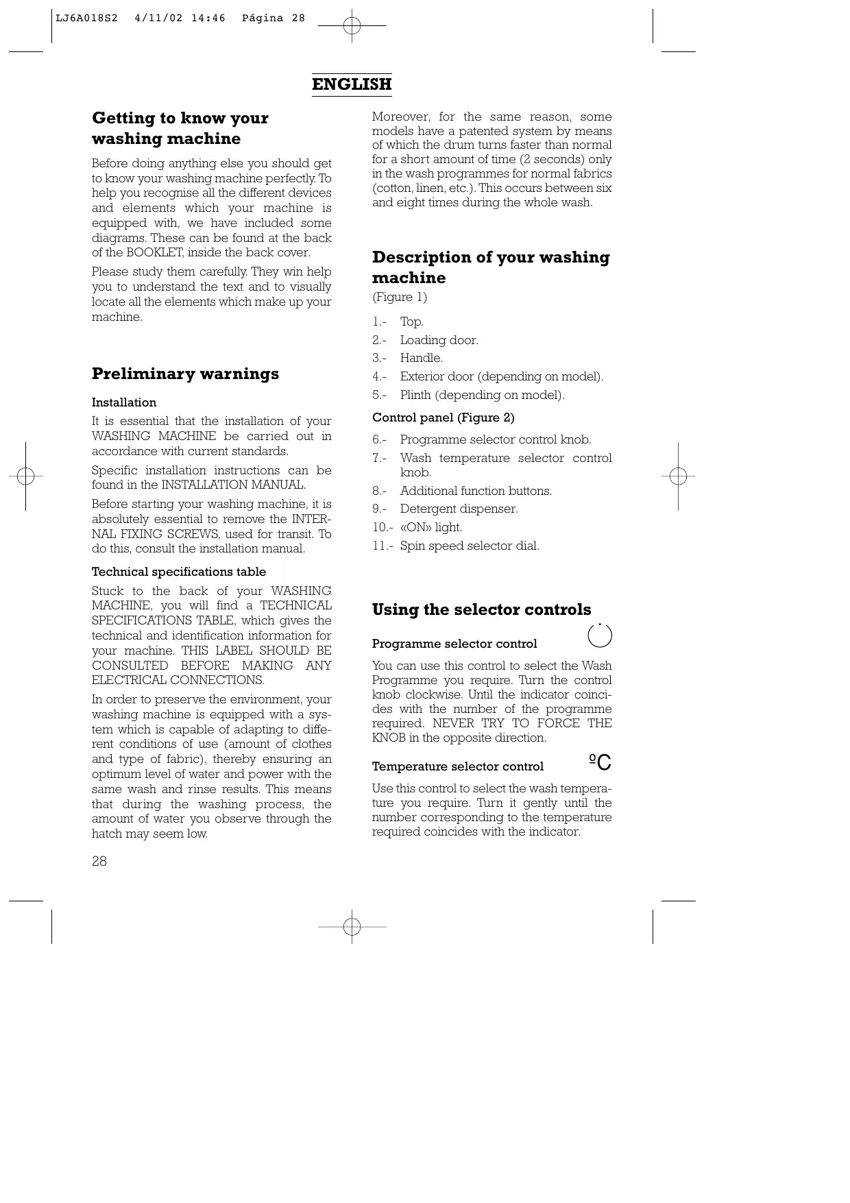 LJ6A018S2 4/11/02 14:46 Pâgina 28 & ENGLISH Getting to know your washing machine Before doing anything else you should get to know your washing machine perfectiy. To help you recognise all the different devices and elements which your machine is equipped with, we have included some diagrams. These can be found at the back of the BOOKLET, inside the back cover. Please study them carefully. They win help you to understand the text and to visually locate all the elements which make up your machine. Preliminary warnings Installation It is essential that the installation of your WASHING MACHINE be carried out in accordance with current standards. Specific installation instructions can be found in the INSTALLATION MANUAL Before starting your washing machine, it is absolutely essential to remove the INTER- NAL FIXING SCREWS, used for transit. To do this, consult the installation manual Technical specifications table Stuck to the back of your WASHING MACHINE, you will find a TECHNICAL SPECIFICATIONS TABLE, which gives the technical and identification information for your machine. THIS LABEL SHOULD BE