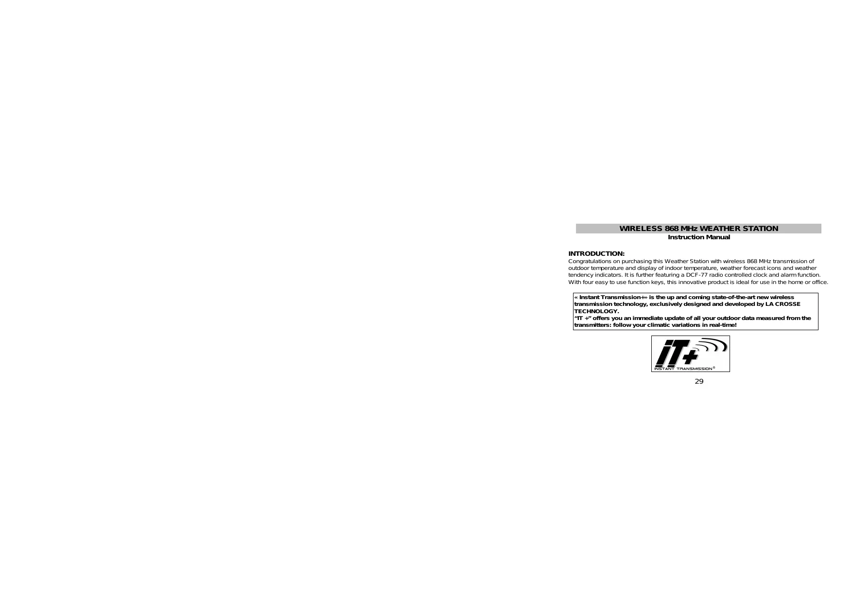 INTRODUCTION: Congratulations on purchasing this Weather Station with wireless 868 MHz transmission of