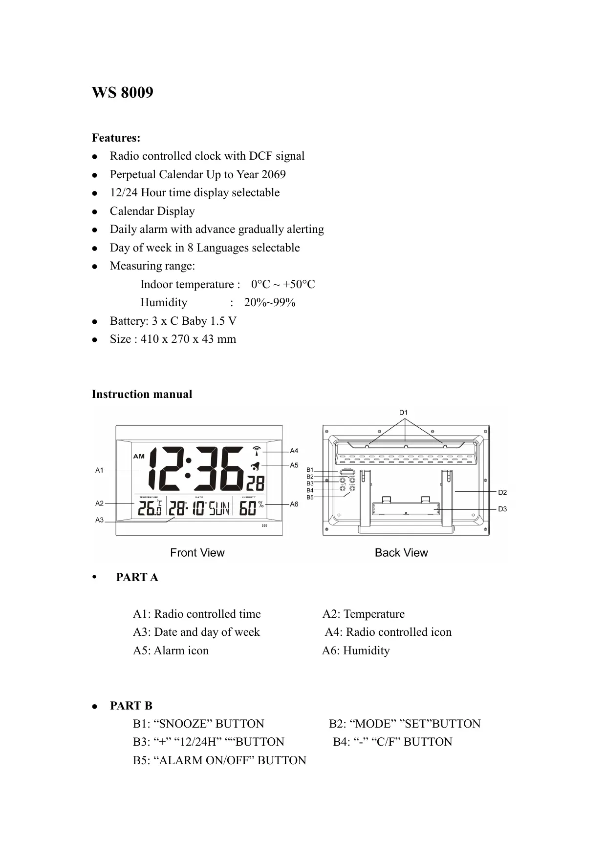 Front View Back View + PARTA Al: Radio controlled time A2: Temperature A3: Date and day of week A4: Radio controlled icon A5: Alarm icon A6: Humidity