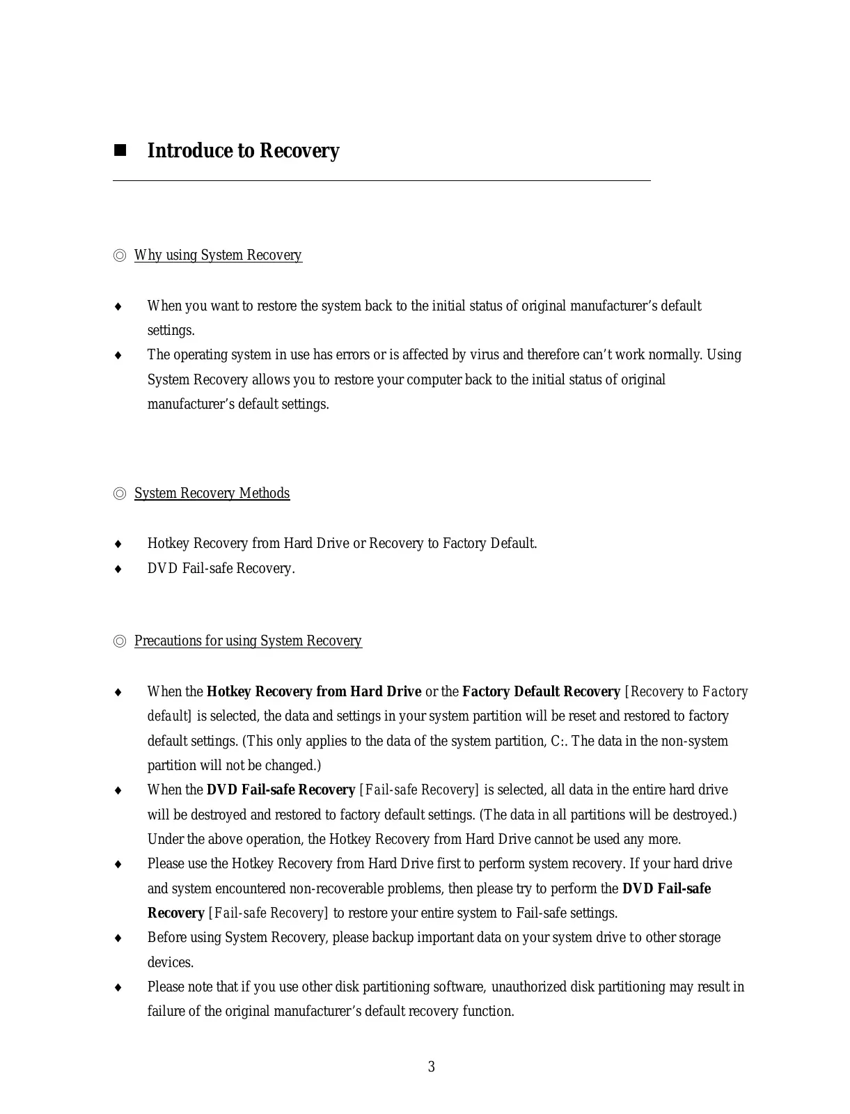 When the DVD Fail-safe Recovery [Fail-safe Recovery] is selected, all data in the entire hard drive will be destroyed and restored to factory default settings. (The data in all partitions will be destroyed.) Under the above operation, the Hotkey Recovery from Hard Drive cannot be used any more.