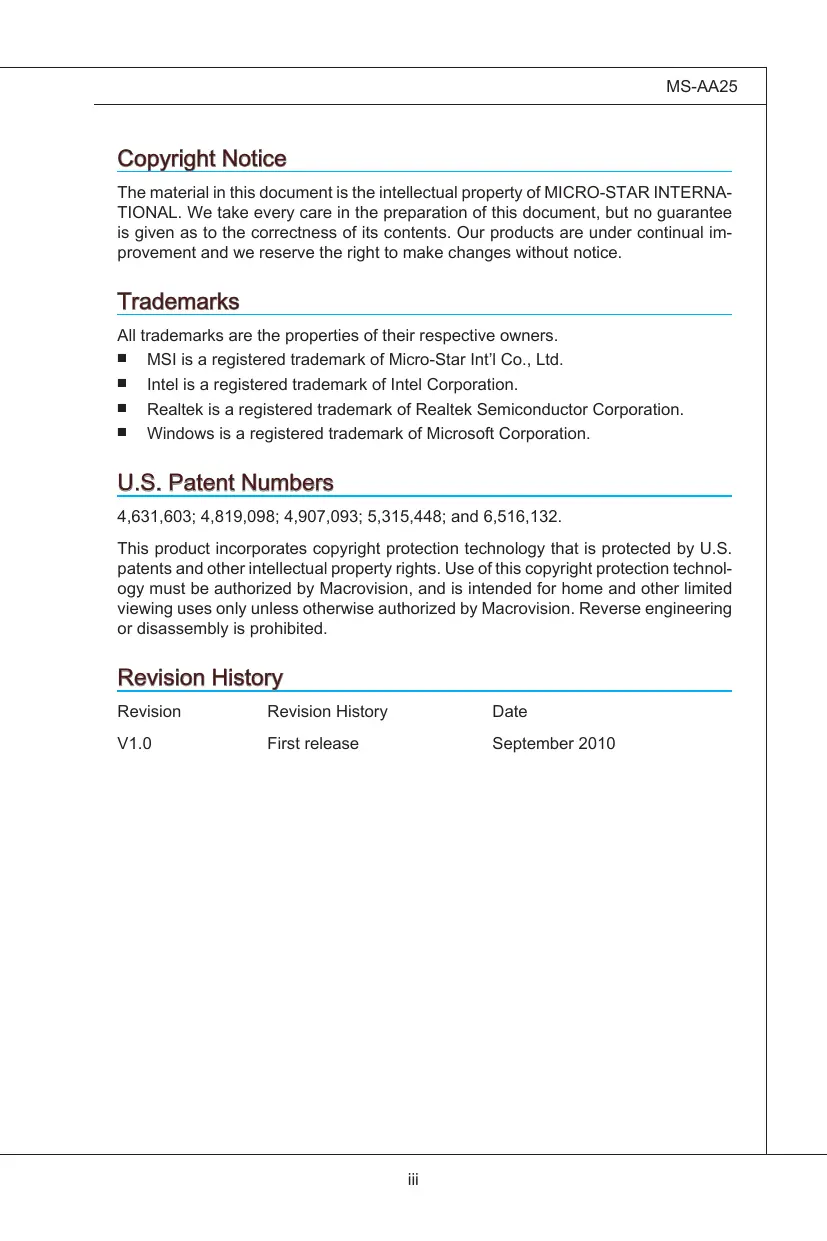 MS-AA25 Copyright Notice The material in this document is the intellectual property of MICRO-STAR INTERNA- TIONAL. We take every care in the preparation of this document, but no guarantee is given as to the correctness of its contents. Our products are under continual im- provement and we reserve the right to make changes without notice. Trademarks All trademarks are the properties of their respective owners. ” MSlis a registered trademark of Micro-Star Intl Co., Ltd. " _Intelis a registered trademark of Intel Corporation. "Realtek is a registered trademark of Realtek Semiconductor Corporation. "Windows is a registered trademark of Microsoft Corporation. U.S. Patent Numbers 4,631,603; 4,819,098; 4,907,093; 5,315,448; and 6,516,132. This product incorporates copyright protection technology that is protected by U.S. patents and other intellectual property rights. Use ofthis copyright protection technol- ogy must be authorized by Macrovision, and is intended for home and other limited viewing uses only unless otherwise authorized by Macrovision. Reverse engineering or disassembly is prohibited. Revision History Revision Revision History Date V1.0 First release September 2010