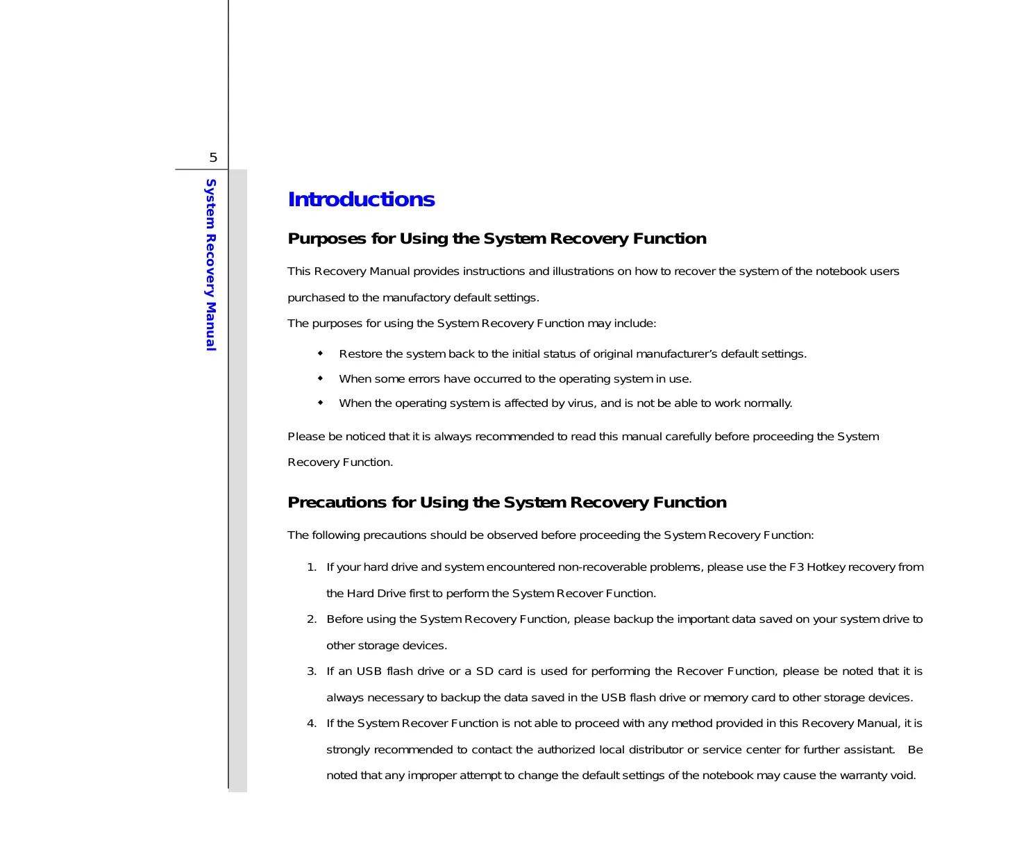 System Recovery Manual Introductions Purposes for Using the System Recovery Function This Recovery Manual provides instructions and illustrations on how to recover the system of the notebook users purchased to the manufactory default settings. The purposes for using the System Recovery Function may include: