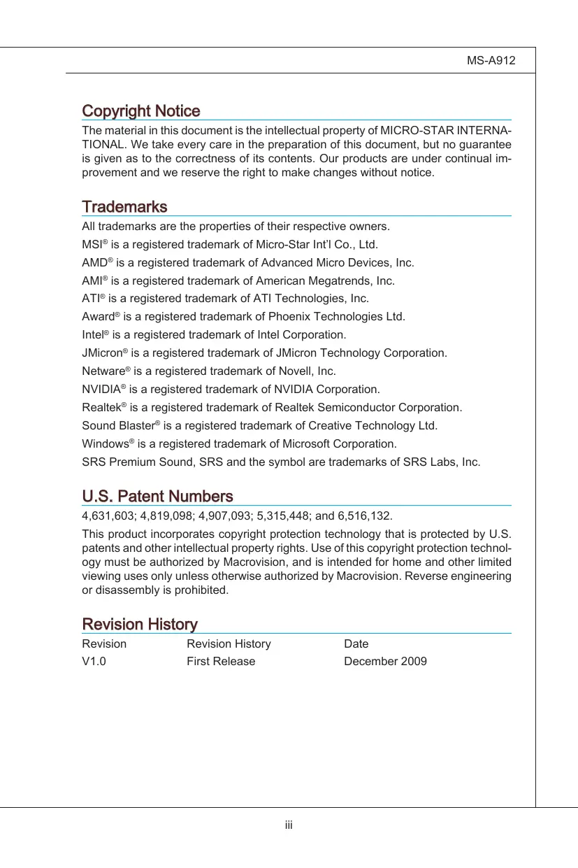 MS-A912 Copyright Notice The material in this document is the intellectual property of MICRO-STAR INTERNA- TIONAL. We take every care in the preparation of this document, but no guarantee is given as to the correctness of its contents. Our products are under continual im- provement and we reserve the right to make changes without notice. Trademarks All trademarks are the properties of their respective owners. MSI is a registered trademark of Micro-Star Int Co., Ltd. AMD° is a registered trademark of Advanced Micro Devices, Inc. AMF is a registered trademark of American Megatrends, Inc. AT is a registered trademark of ATI Technologies, Inc. Award® is a registered trademark of Phoenix Technologies Ltd. Intel® is a registered trademark of Intel Corporation. JMicron® is a registered trademark of JMicron Technology Corporation. Netware® is a registered trademark of Novell, Inc. NVIDIA is a registered trademark of NVIDIA Corporation. Realtek” is a registered trademark of Realtek Semiconductor Corporation. Sound Blaster” is a registered trademark of Creative Technology Ltd. Windows” is a registered trademark of Microsoft Corporation. SRS Premium Sound, SRS and the symbol are trademarks of SRS Labs, Inc. U.S. Patent Numbers 4,631,603; 4,819,098; 4,907,093; 5,315,448; and 6,516,132. This product incorporates copyright protection technology that is protected by U.S. patents and other intellectual property rights. Use of this copyright protection technol- ogy must be authorized by Macrovision, and is intended for home and other limited viewing uses only unless otherwise authorized by Macrovision. Reverse engineering or disassembly is prohibited. Revision History Revision Revision History Date V1.0 First Release December 2009