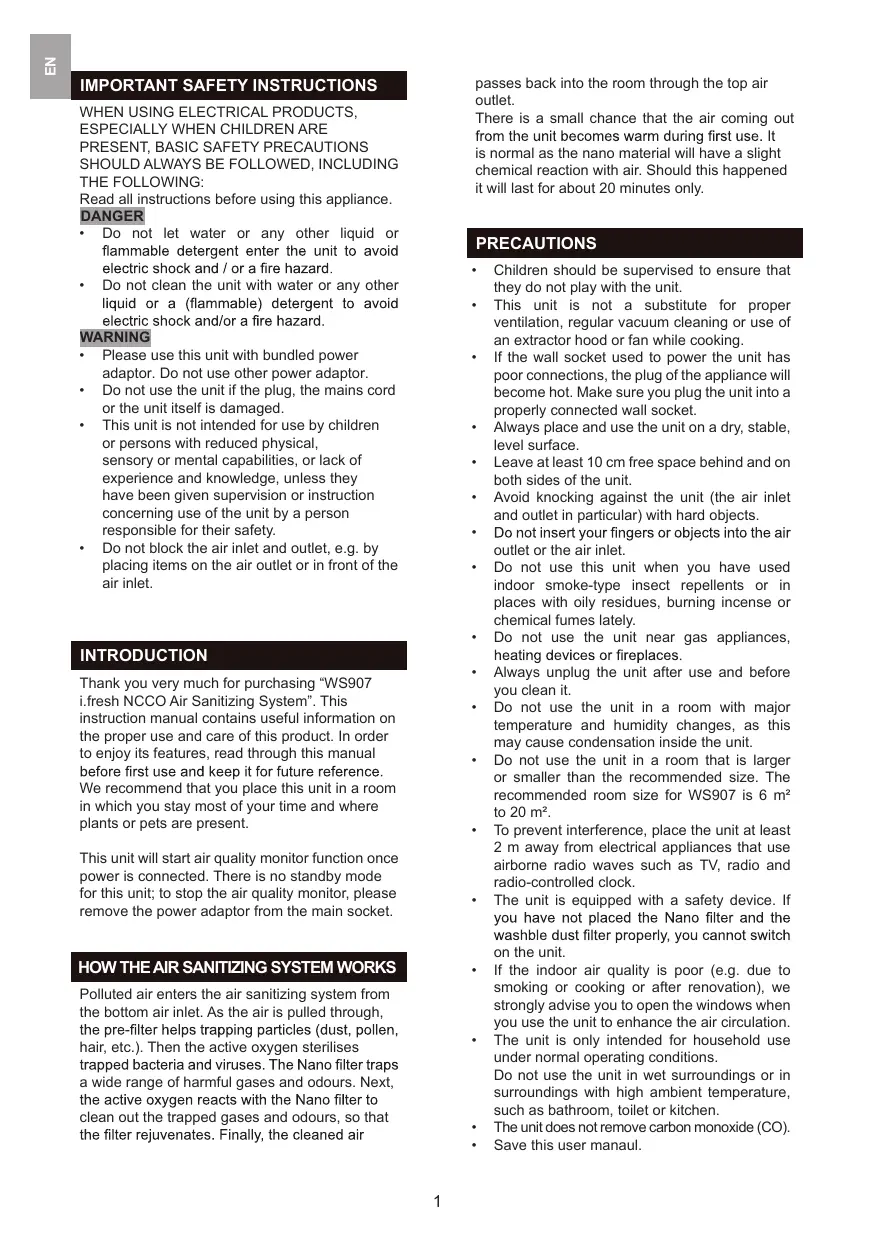 Children should be supervised to ensure that they do not play with the unit. This unit is not a substitute for proper ventilation, regular vacuum cleaning or use of an extractor hood or fan while cooking. If the wall socket used to power the unit has poor connections, the plug of the appliance will become hot. Make sure you plug the unit into a properly connected wall socket. Always place and use the unit on a dry, stable, level surface. Leave at least 10 cm free space behind and on both sides of the unit. Avoid knocking against the unit (the air inlet and outlet in particular) with hard objects. outlet or the air inlet. Do not use this unit when you have used indoor smoke-type insect repellents or in places with oily residues, burning incense or chemical fumes lately. Do not use the unit near gas appliances, Always unplug the unit after use and before you clean it. Do not use the unit in a room with major temperature and humidity changes, as this may cause condensation inside the unit. Do not use the unit in a room that is larger or smaller than the recommended size. The recommended room size for WS907 is 6 m² to 20 m². To prevent interference, place the unit at least 2 m away from electrical appliances that use airborne radio waves such as TV, radio and radio-controlled clock. The unit is equipped with a safety device. If on the unit. If the indoor air quality is poor (e.g. due to smoking or cooking or after renovation), we strongly advise you to open the windows when you use the unit to enhance the air circulation. The unit is only intended for household use under normal operating conditions. Do not use the unit in wet surroundings or in surroundings with high ambient temperature, such as bathroom, toilet or kitchen. The unit does not remove carbon monoxide (CO). Save this user manaul.