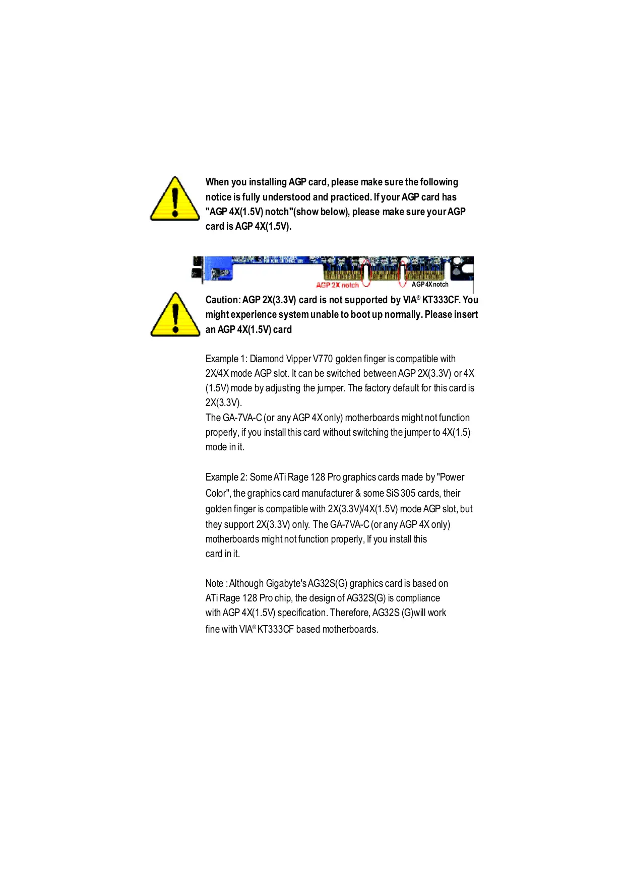When you installing AGP card, please make sure the following notice is fully understood and practiced. If your AGP card has "AGP 4X(1.5V) notch"(show below), please make sure your AGP cardis AGP 4X(1.5V). AGP4Xnotch AGP 2X notch Caution: AGP 2X(3.3V) card is not supported by VIA® KT333CF. You might experience system unable to boot up normally. Please insert an AGP 4X(1.5V) card Example 1: Diamond Vipper V770 golden finger is compatible with 2X/4X mode AGP slot. It can be switched between AGP 2X(3.3V) or 4X (1.5V) mode by adjusting the jumper. The factory default for this card is 2X(3.3V). The GA-7VA-C (or any AGP 4X only) motherboards might not function proper, if you install this card without switching the jumper to 4X(1.5) mode in it. Example 2: Some ATi Rage 128 Pro graphics cards made by "Power Color", the graphics card manufacturer & some SiS 305 cards, their golden finger is compatible with 2X(3.3V)/4X(1.5V) mode AGP slot, but they support 2X(3.3V) only. The GA-7VA-C (or any AGP 4X only) motherboards might not function propery, If you install this card init. Note : Although Gigabyte's AG32S(G) graphics card is based on ATiRage 128 Pro chip, the design of AG32S(G) is compliance With AGP 4X(1.5V) specification. Therefore, AG32S (G)will work fine with VIA®KT333CF based motherboards.