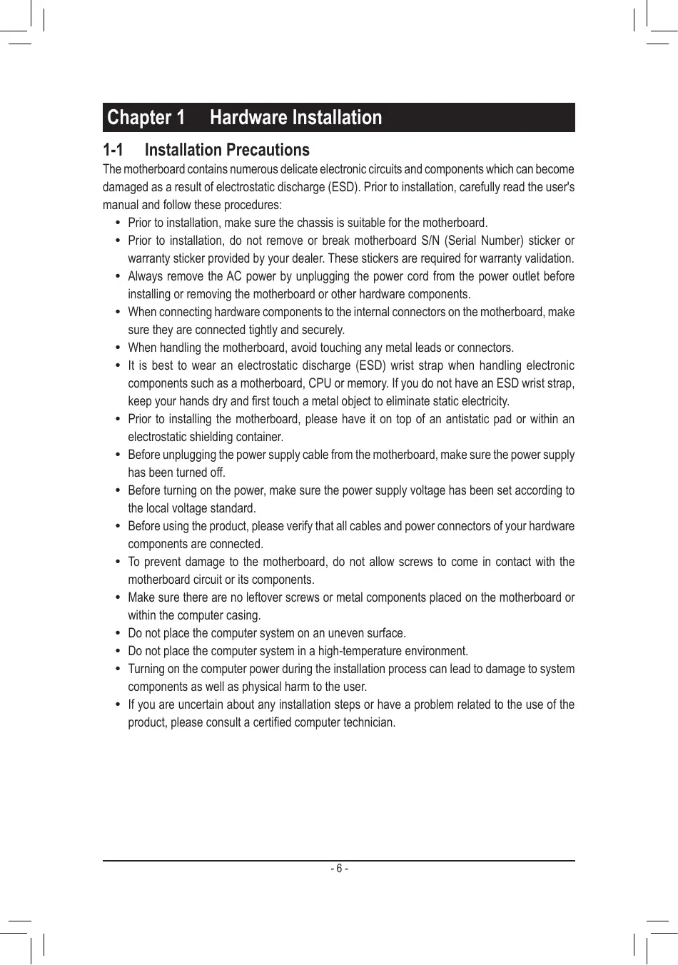 apter 1 Hardware Installat 1-1 Installation Precautions The motherboard contains numerous delicate electronic circuits and components which can become damaged as a result of electrostatic discharge (ESD). Prior to installation, carefully read the user's manual and follow these procedures: Prior to installation, make sure the chassis is suitable for the motherboard. Prior to installation, do not remove or break motherboard S/N (Serial Number) sticker or warranty sticker provided by your dealer. These stickers are required for warranty validation. Always remove the AC power by unplugging the power cord from the power outlet before installing or removing the motherboard or other hardware components. When connecting hardware components to the internal connectors on the motherboard, make sure they are connected tightly and securely. When handling the motherboard, avoid touching any metal leads or connectors. lt is best to wear an electrostatic discharge (ESD) wrist strap when handling electronic components such as a motherboard, CPU or memory. If you do not have an ESD wrist strap, keep your hands dry and first touch a metal object to eliminate static electricity. Prior to installing the motherboard, please have it on top of an antistatic pad or within an electrostatic shielding container. Before unplugging the power supply cable from the motherboard, make sure the power supply has been turned off. Before turning on the power, make sure the power supply voltage has been set according to the local voltage standard. Before using the product, please verify that all cables and power connectors of your hardware components are connected. To prevent damage to the motherboard, do not allow screws to come in contact with the motherboard circuit or its components. Make sure there are no leftover screws or metal components placed on the motherboard or Within the computer casing. Do not place the computer system on an uneven surface. Do not place the computer system in a high-temperature environment. Turning on the computer power during the installation process can lead to damage to system components as well as physical harm to the user. If you are uncertain about any installation steps or have a problem related to the use of the product, please consult a certified computer technician.