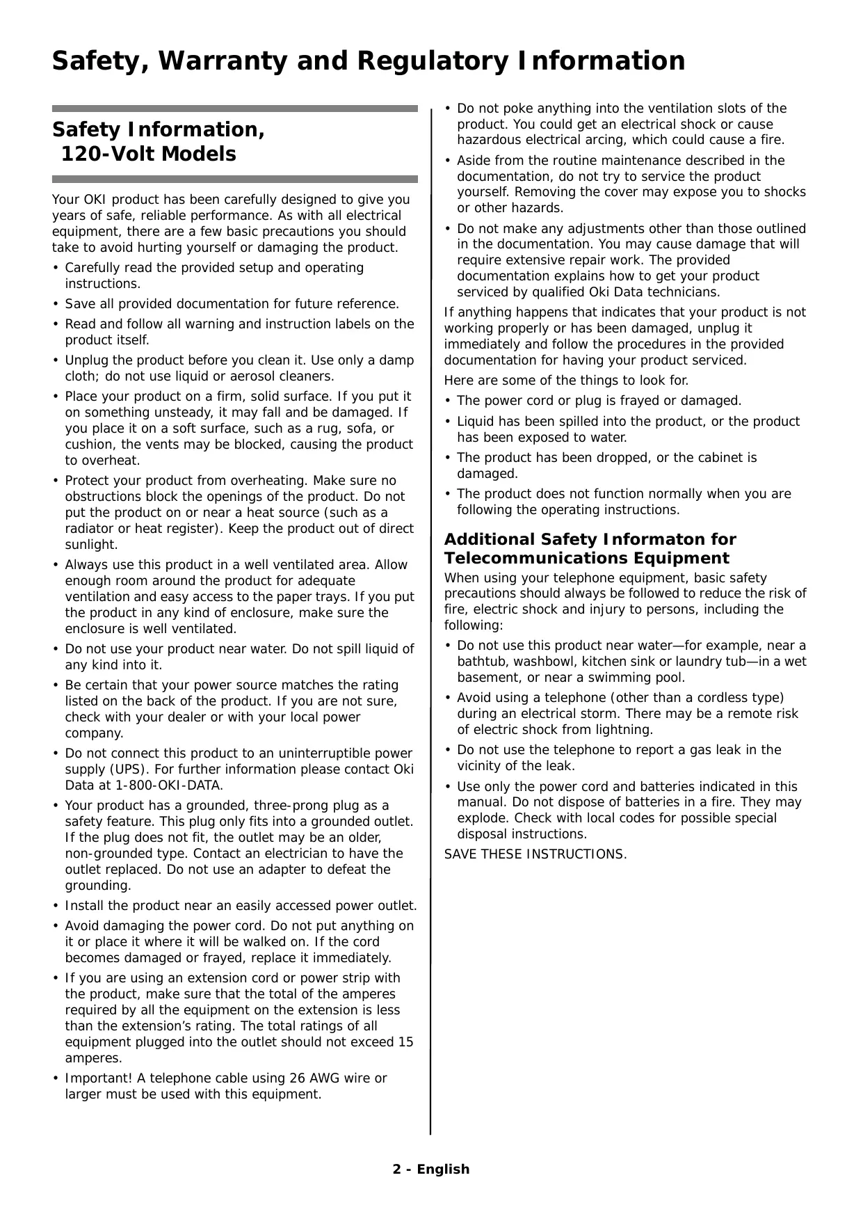 - Do not poke anything into the ventilation slots of the product. You could get an electrical shock or cause hazardous electrical arcing, which could cause a fire. Safety Information, 120-Volt Models Your OKI product has been carefully designed to give you years of safe, reliable performance. As with all electrical equipment, there are a few basic precautions you should take to avoid hurting yourself or damaging the product.