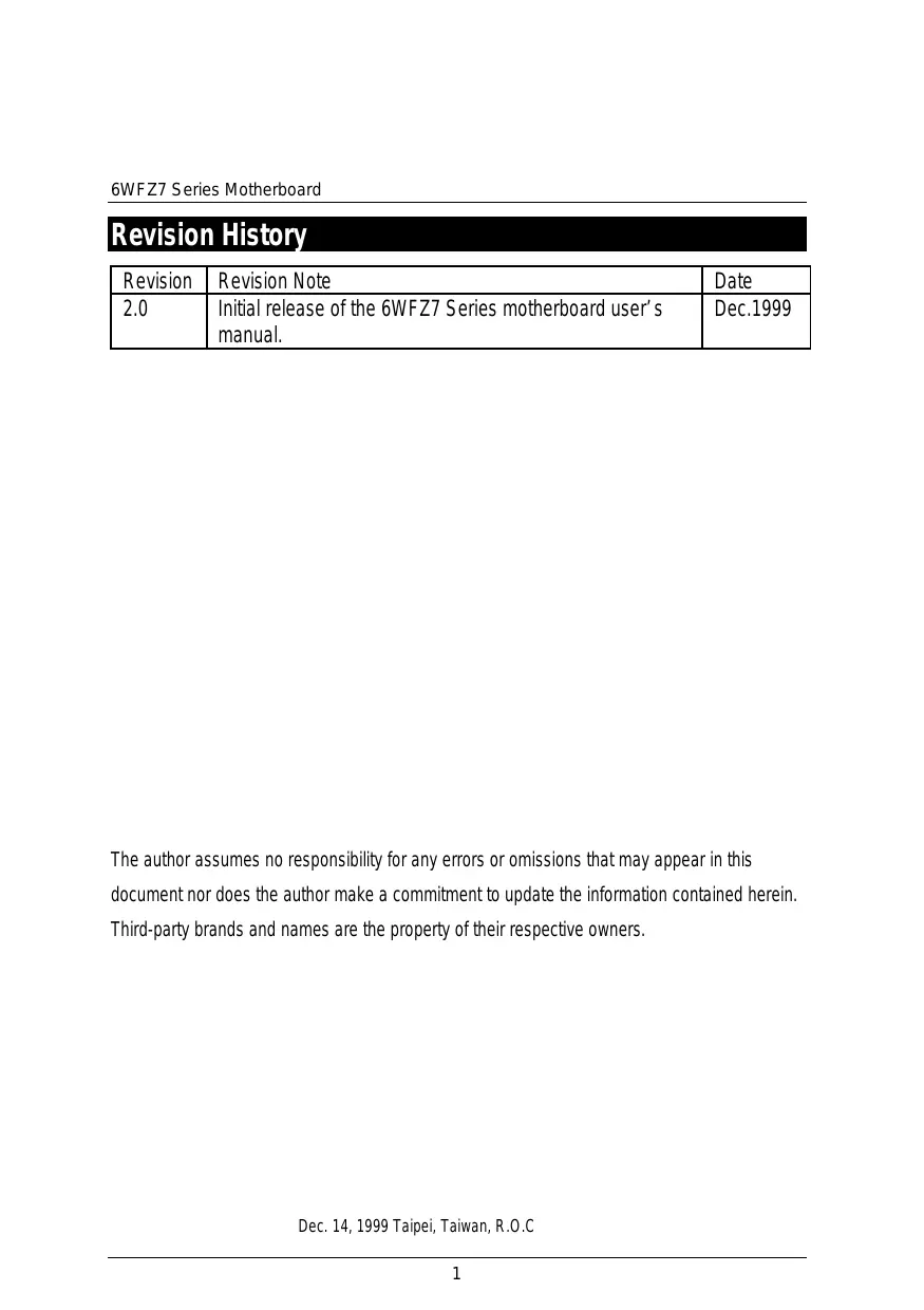 Revision Histo Revision | Revision Note Date 2.0 Initial release of the 6WFZ7 Series motherboard user's Dec.1999