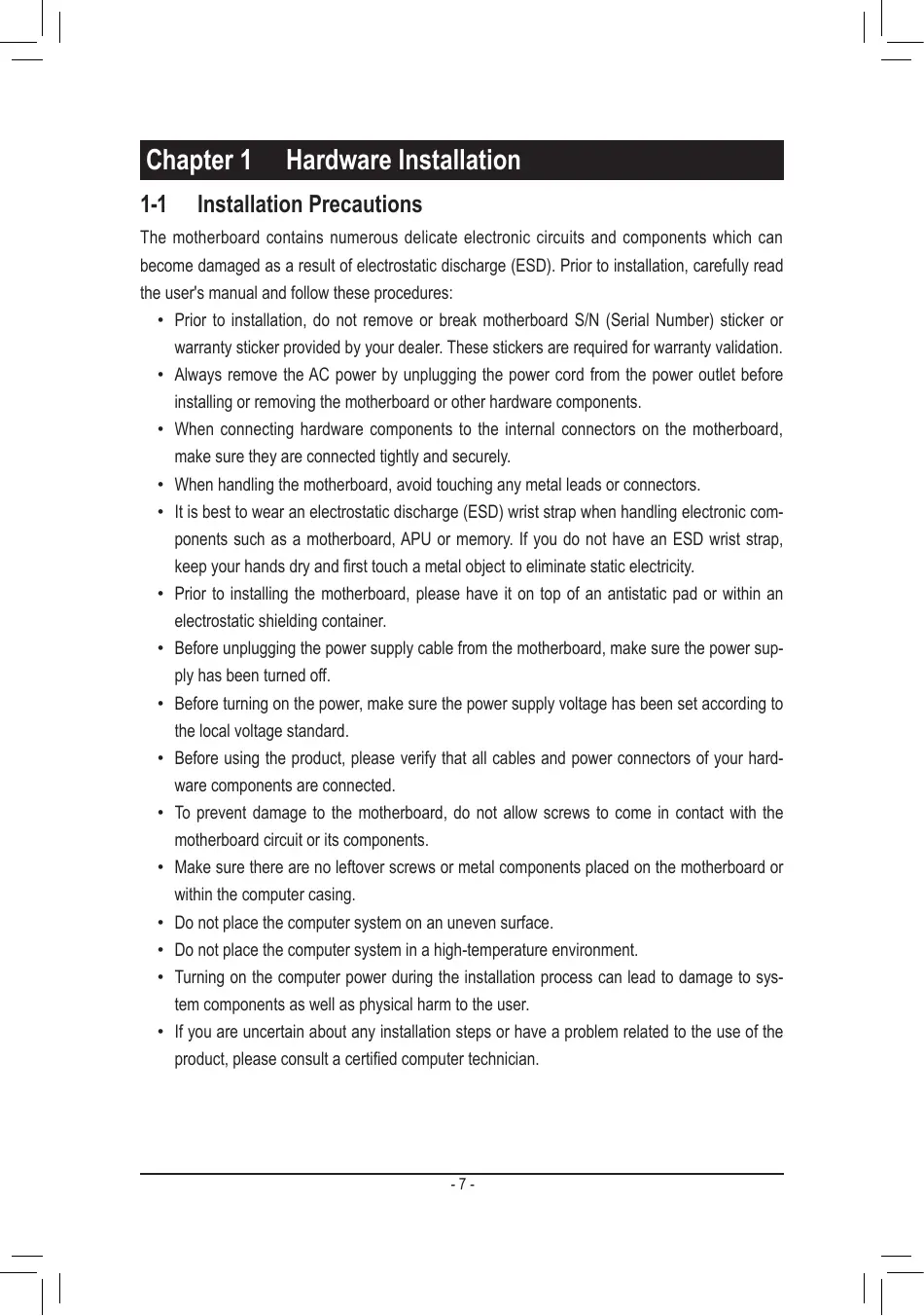 pter 1 Hardware Installat 141 Installation Precautions The motherboard contains numerous delicate electronic circuits and components which can become damaged as a result of electrostatic discharge (ESD). Prior to installation, carefully read the user's manual and follow these procedures: + Prior to installation, do not remove or break motherboard S/N (Serial Number) sticker or warranty sticker provided by your dealer. These stickers are required for warranty validation. Always remove the AC power by unplugging the power cord from the power outlet before installing or removing the motherboard or other hardware components. When connecting hardware components to the internal connectors on the motherboard, make sure they are connected tightly and securely. When handling the motherboard, avoid touching any metal leads or connectors. Itis best to wear an electrostatic discharge (ESD) wrist strap when handling electronic com- ponents such as a motherboard, APU or memory. If you do not have an ESD wrist strap, keep your hands dry and first touch a metal object to eliminate static electricity. Prior to installing the motherboard, please have it on top of an antistatic pad or within an electrostatic shielding container. Before unplugging the power supply cable from the motherboard, make sure the power sup- ply has been turned off. Before turning on the power, make sure the power supply voltage has been set according to the local voltage standard. Before using the product, please verify that all cables and power connectors of your hard- ware components are connected. To prevent damage to the motherboard, do not allow screws to come in contact with the motherboard circuit or its components. Make sure there are no leftover screws or metal components placed on the motherboard or Within the computer casing. Do not place the computer system on an uneven surface. Do not place the computer system in a high-temperature environment. Turning on the computer power during the installation process can lead to damage to sys- tem components as well as physical harm to the user. If you are uncertain about any installation steps or have a problem related to the use of the product, please consult a certified computer technician.