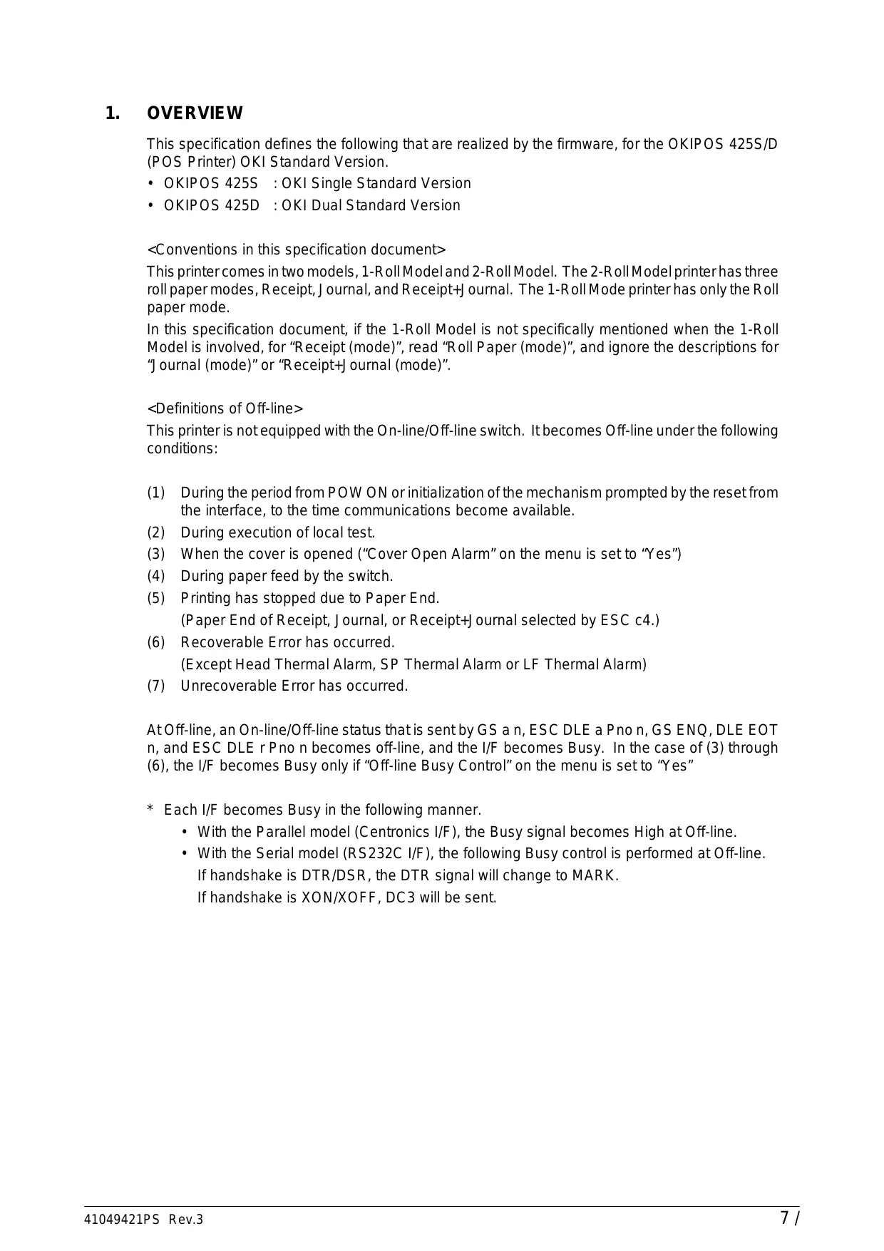 - OKIPOS 425D : OKI Dual Standard Version <Conventions in this specification document> This printer comes in two models, 1-Roll Model and 2-Roll Model. The 2-Roll Model printer has three roll paper modes, Receipt, Journal, and Receipt+Journal. The 1-Roll Mode printer has only the Roll paper mode. In this specification document, if the 1-Roll Model is not specifically mentioned when the 1-Roll Model is involved, for “Receipt (mode)”, read “Roll Paper (mode)”, and ignore the descriptions for “Journal (mode)” or “Receipt+Journal (mode)”. <Definitions of Off-line> This printer is not equipped with the On-line/Off-line switch. It becomes Off-line under the following conditions: (1) (2) (3) (4) (5) (6) (7) During the period from POW ON or initialization of the mechanism prompted by the reset from the interface, to the time communications become available. During execution of local test. When the cover is opened (“Cover Open Alarm” on the menu is set to “Yes”) During paper feed by the switch. Printing has stopped due to Paper End. (Paper End of Receipt, Journal, or Receipt+Journal selected by ESC c4.) Recoverable Error has occurred. (Except Head Thermal Alarm, SP Thermal Alarm or LF Thermal Alarm) Unrecoverable Error has occurred. At Off-line, an On-line/Off-line status that is sent by GS a n, ESC DLE a Pno n, GS ENQ, DLE EOT n, and ESC DLE r Pno n becomes off-line, and the I/F becomes Busy. In the case of (3) through (6), the I/F becomes Busy only if “Off-line Busy Control” on the menu is set to “Yes”