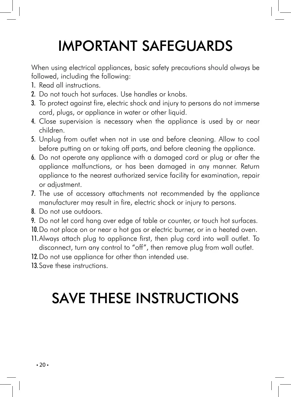IMPORTANT SAFEGUARDS When using electrical appliances, basic safety precautions should always be followed, including the following: 1. Read all instructions. 2. Do not touch hot surfaces. Use handles or knobs. 3. To protect against fire, electric shock and injury to persons do not immerse cord, plugs, or appliance in water or other liquid. 4. Close supervision is necessary when the appliance is used by or near children. 5. Unplug from outlet when not in use and before cleaning. Allow to cool before putting on or taking off parts, and before cleaning the appliance. 6. Do not operate any appliance with a damaged cord or plug or after the appliance malfunctions, or has been damaged in any manner. Return appliance to the nearest authorized service facility for examination, repair or adjustment. 7. The use of accessory attachments not recommended by the appliance manufacturer may result in fire, electric shock or injury to persons. 8. Do not use outdoors. 9. Do not let cord hang over edge of table or counter, or touch hot surfaces. 10. Do not place on or near a hot gas or electric burner, or in a heated oven. 11. Always attach plug to appliance first, then plug cord into wall outlet. To disconnect, turn any control to “off”, then remove plug from wall outlet. 12. Do not use appliance for other than intended use. 13. Save these instructions.