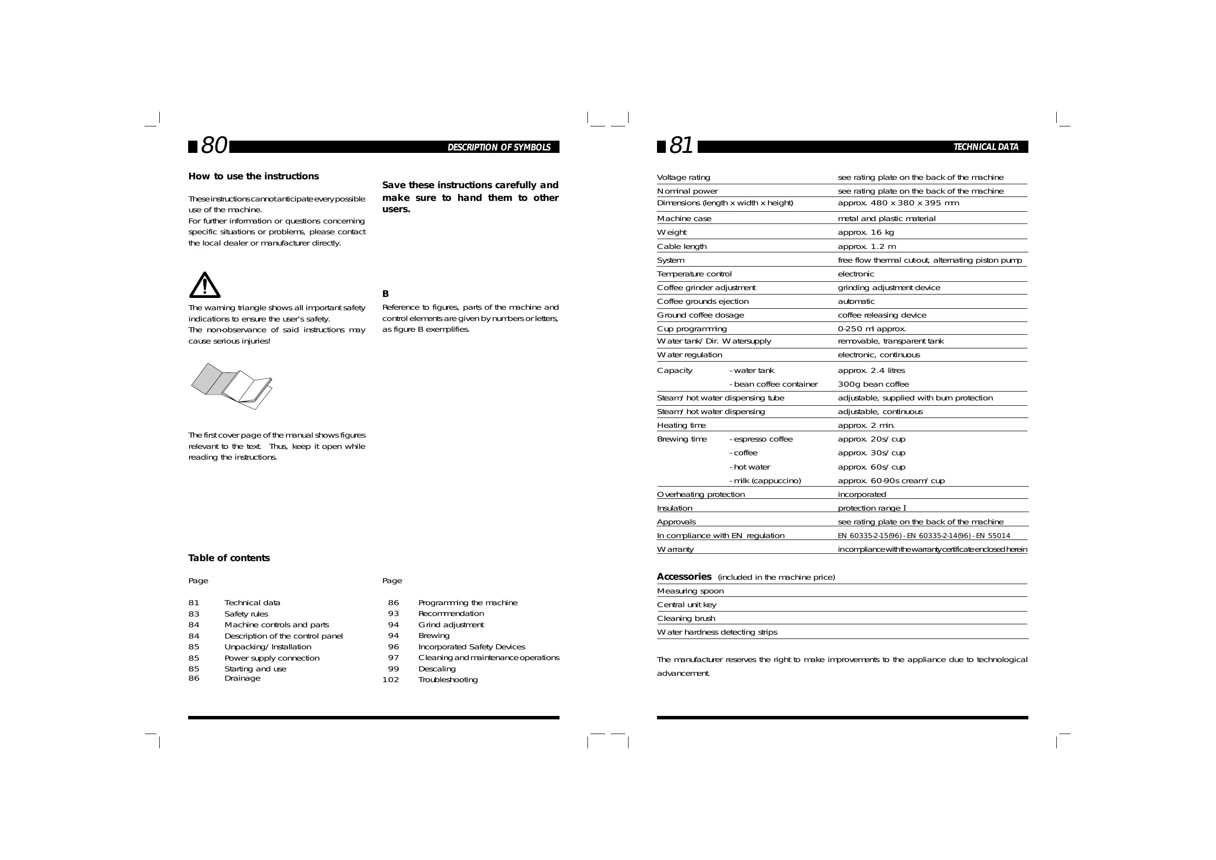TECHNICAL DATA Programming the machine Recommendation Grind adjustment Brewing Incorporated Safety Devices Cleaning and maintenance operations Descaling Troubleshooting