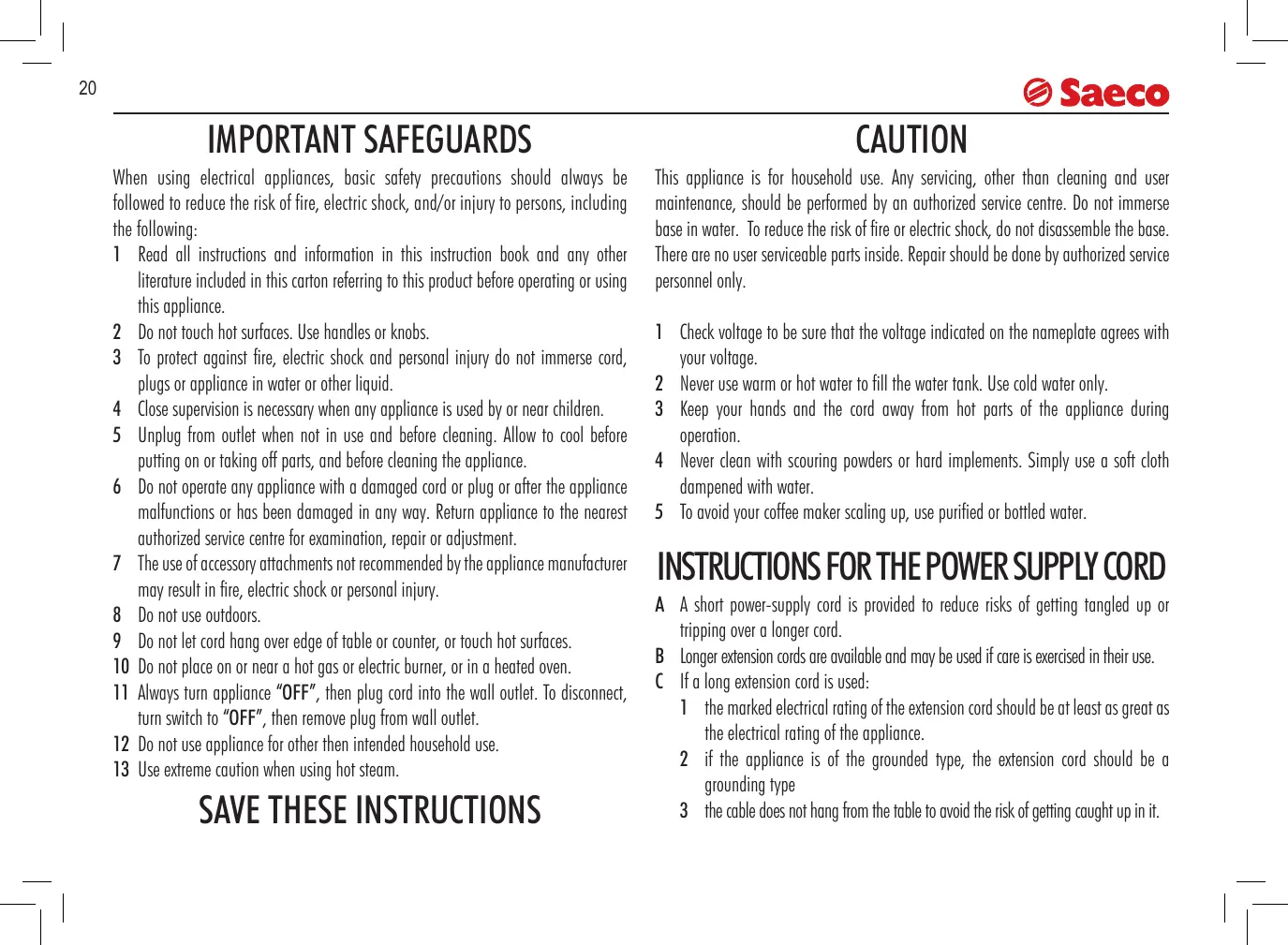 © Saeco INSTRUCTIONS FOR END-OF-LIFE DISPOSAL TREATMENT This product complies with EU Directive 2002/96/EC.